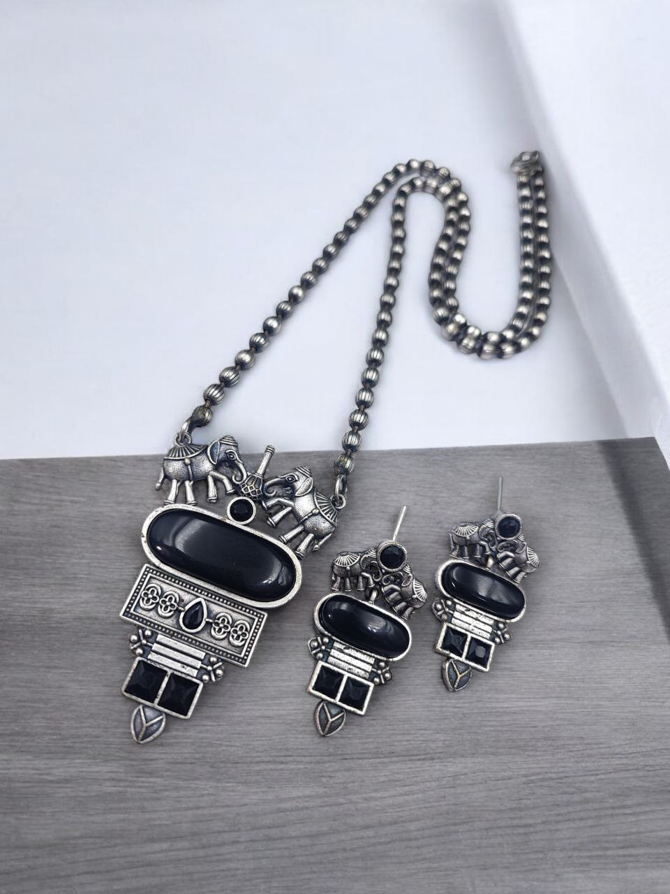 Black Indian Elephant Designer Oxidized Silver Monalisa Stone Necklace Chain Pendant with Earring Set
