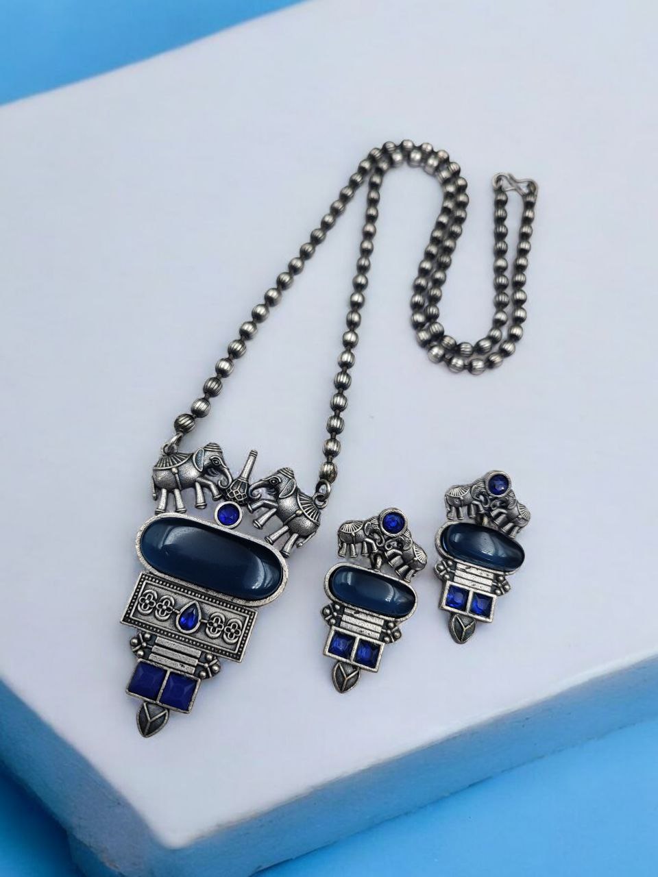 Blue Indian Elephant Designer Oxidized Silver Monalisa Stone Necklace Chain Pendant with Earring Set