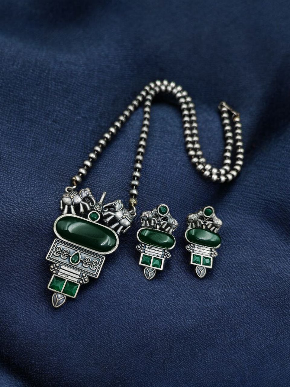 Mint Indian Elephant Designer Oxidized Silver Monalisa Stone Necklace Chain Pendant with Earring Set