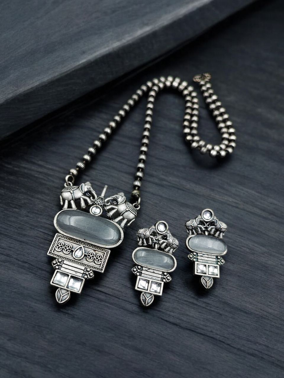Grey Indian Elephant Designer Oxidized Silver Monalisa Stone Necklace Chain Pendant with Earring Set