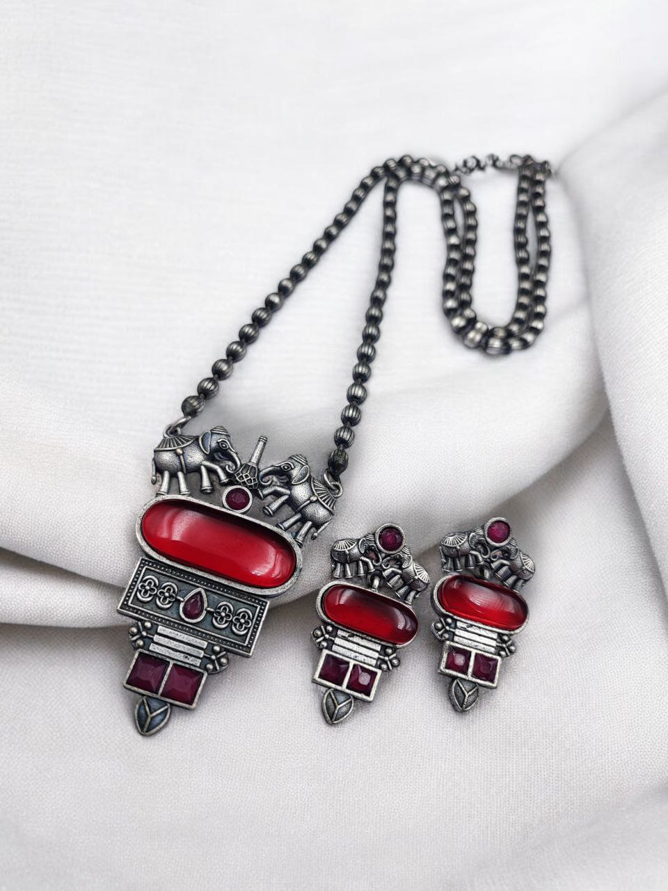 Red Indian Elephant Designer Oxidized Silver Monalisa Stone Necklace Chain Pendant with Earring Set