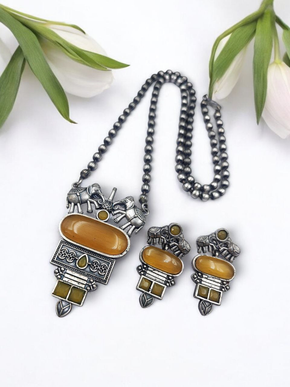 Yellow Indian Elephant Designer Oxidized Silver Monalisa Stone Necklace Chain Pendant with Earring Set