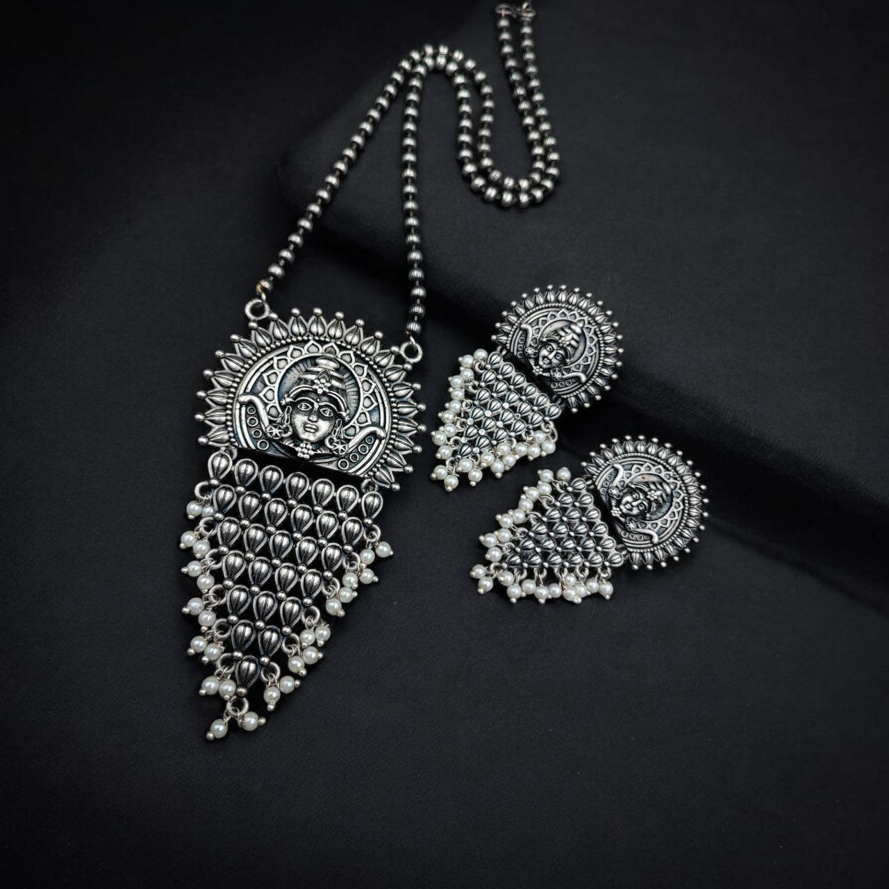Navratri Special Goddess Durga Oxidized Silver Necklace Chain Pendant with Earring Set