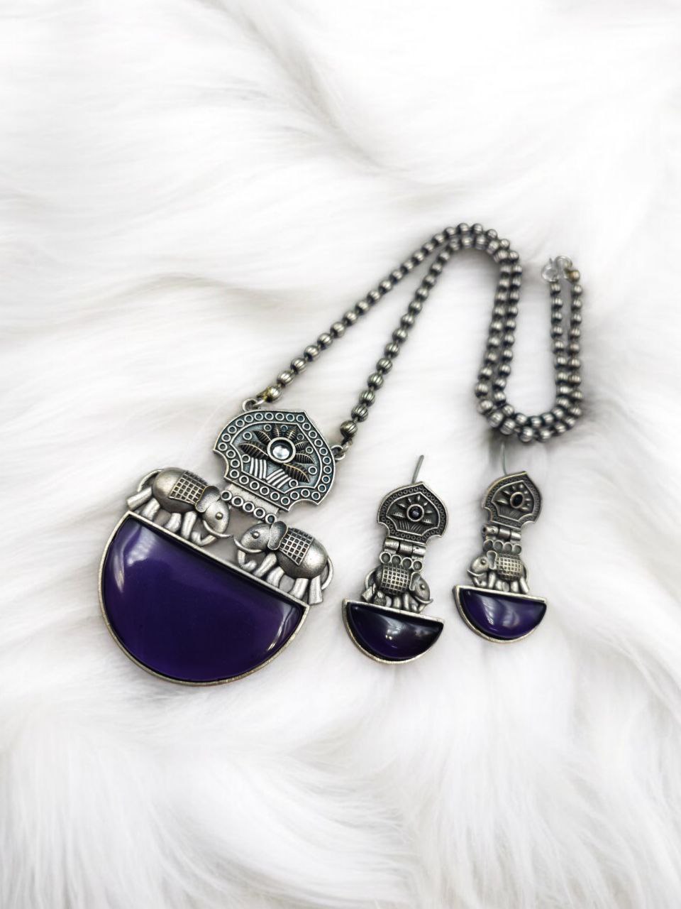 Amethyst Traditional Indian Elephant Designer Oxidized Silver Monalisa Stone Pendant Necklace with Matching Earrings