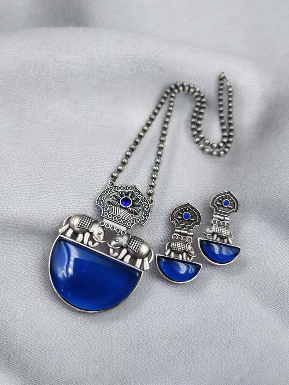 Blue Traditional Indian Elephant Designer Oxidized Silver Monalisa Stone Pendant Necklace with Matching Earrings