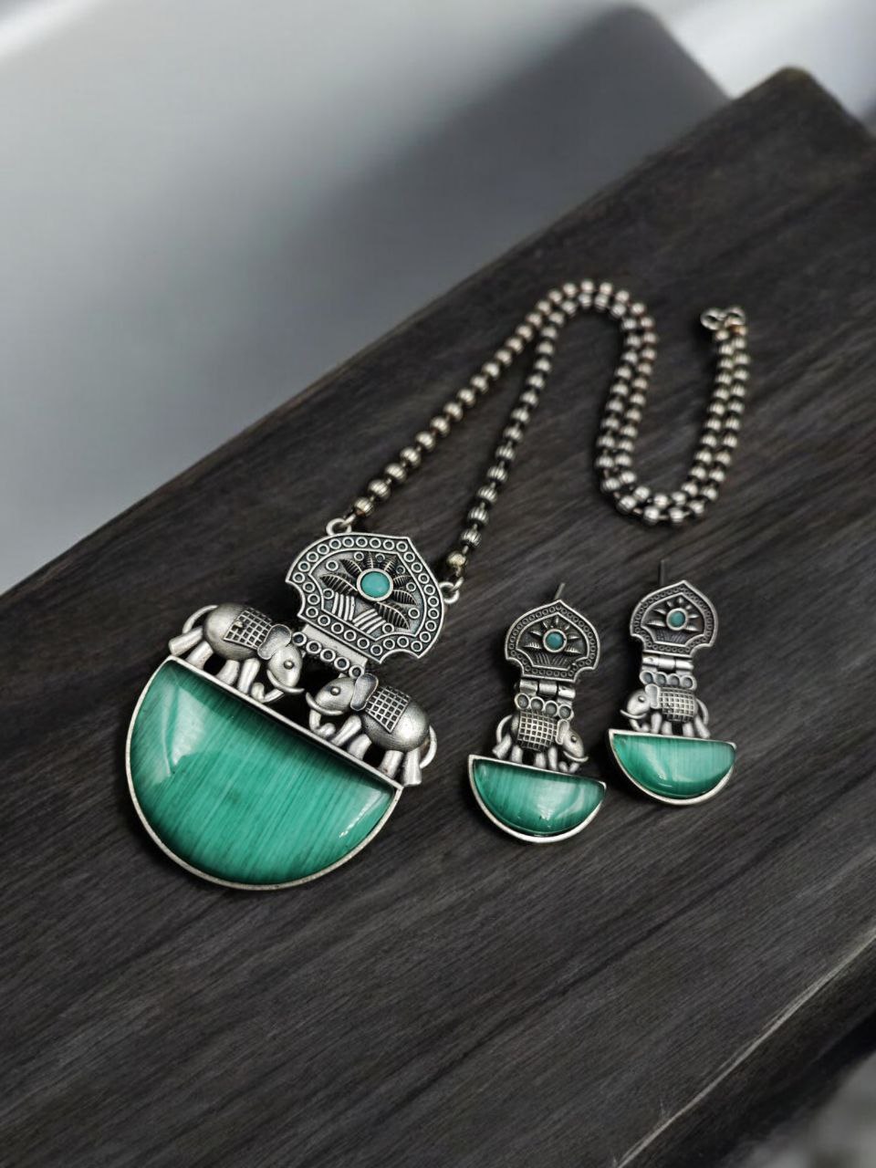 Mint Traditional Indian Elephant Designer Oxidized Silver Monalisa Stone Pendant Necklace with Matching Earrings