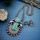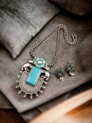Aqua Indian Bohemian Elephant Silver Oxidized Monalisa Stone Necklace Pendant Chain with Earring Set