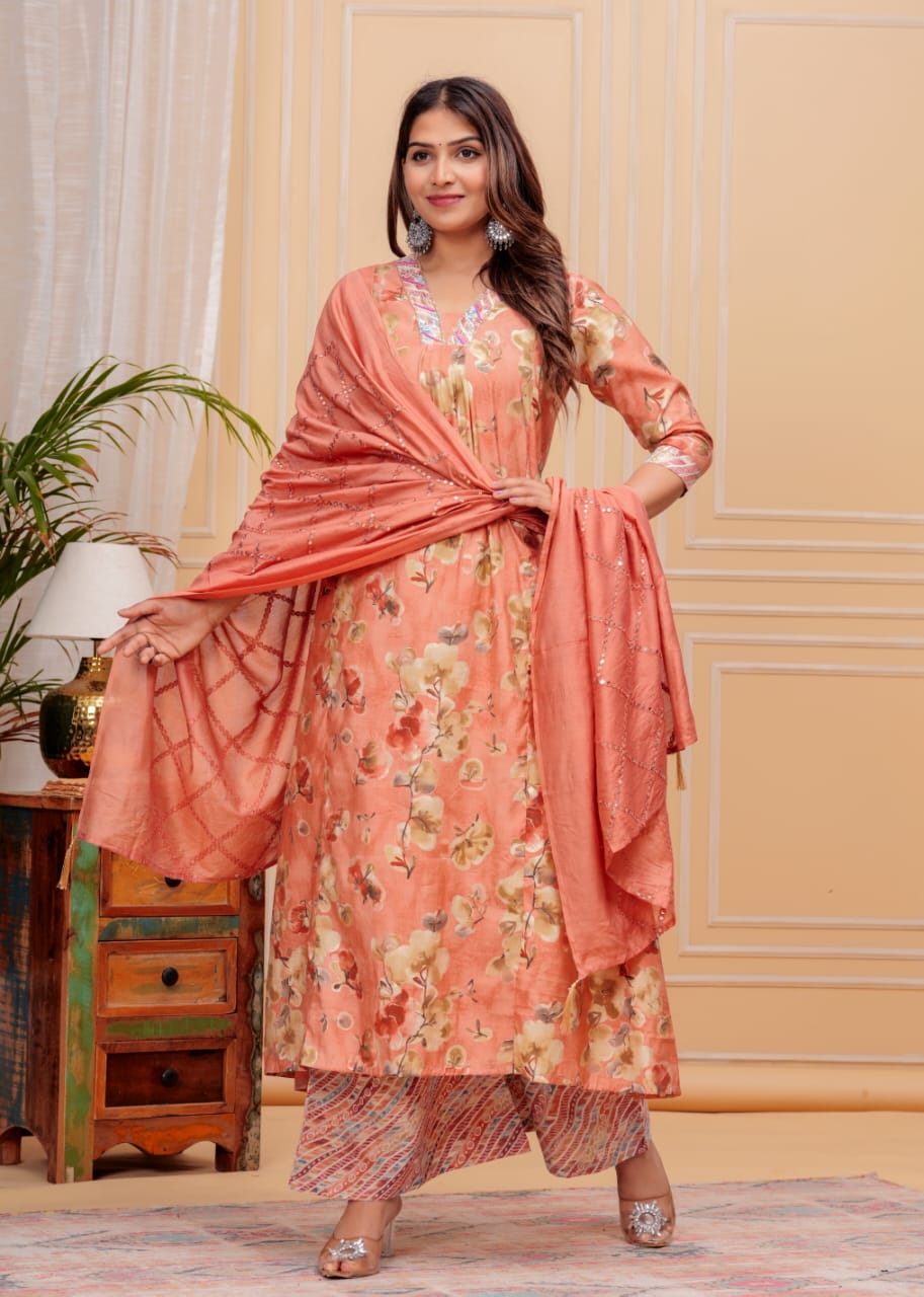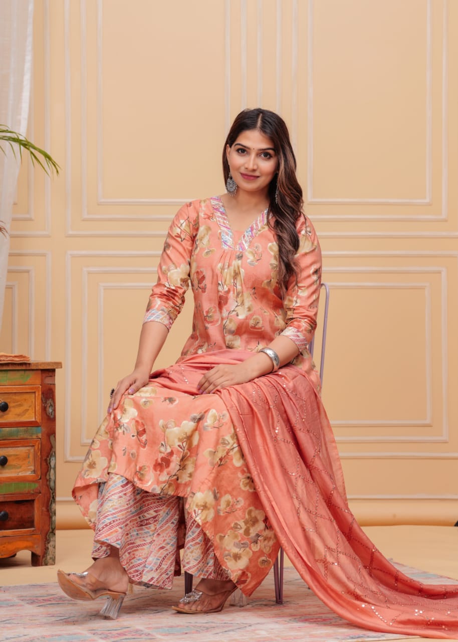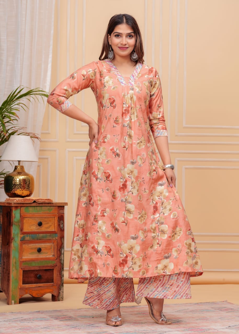 Peach Muslin Floral Print Indian A-line Cut Salwar Kameez Kurti Palazzo Pant Set for Women Partywear Dress