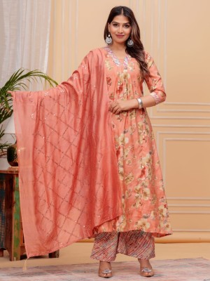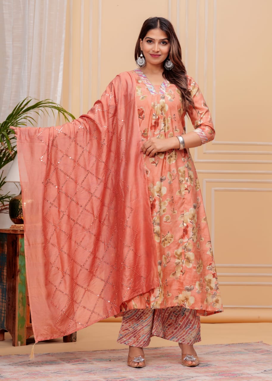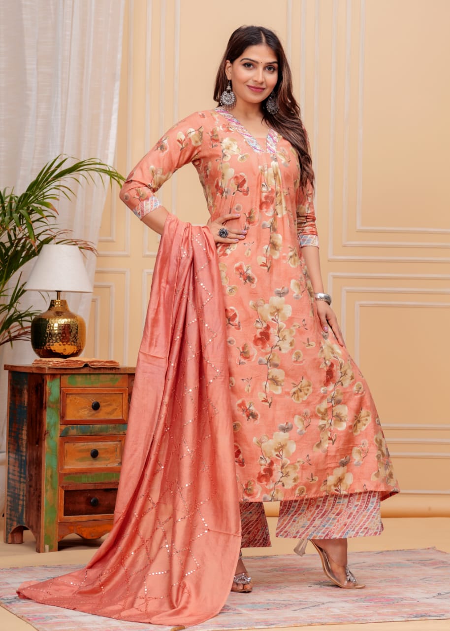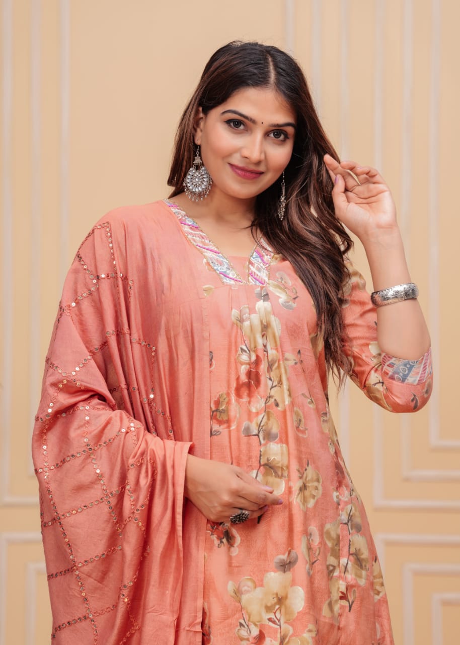 Peach Muslin Floral Print Indian A-line Cut Salwar Kameez Kurti Palazzo Pant Set for Women Partywear Dress