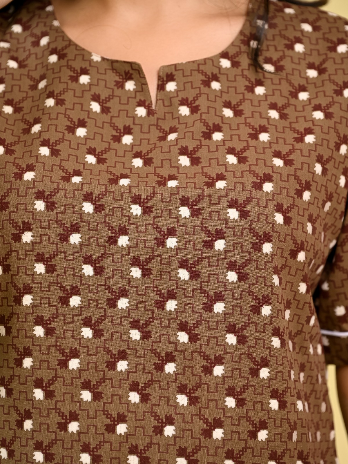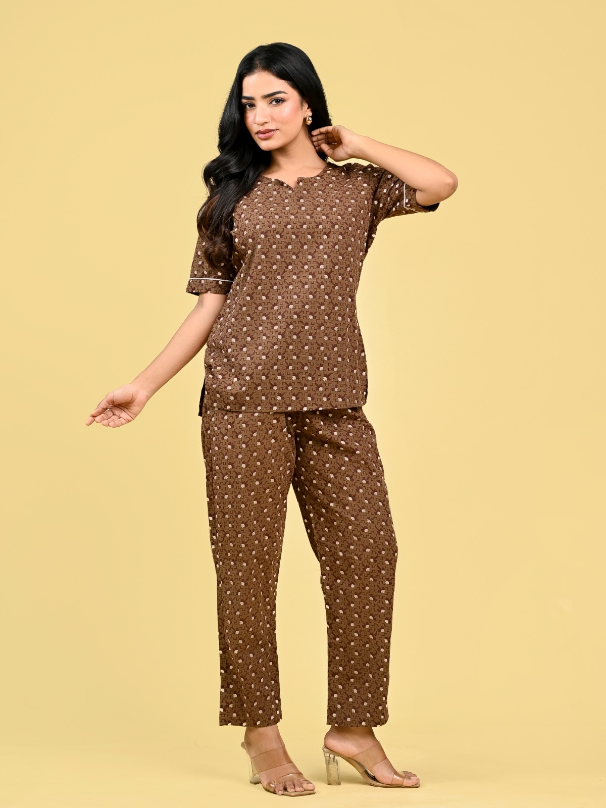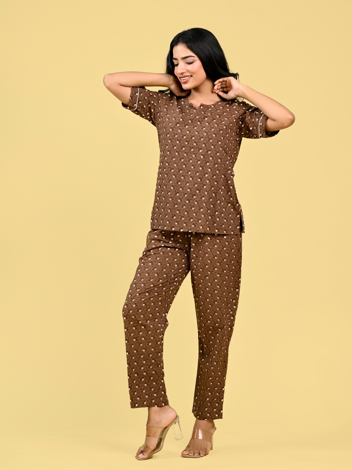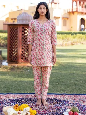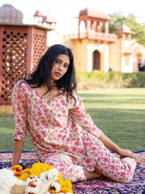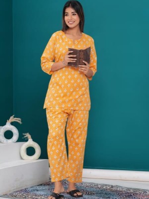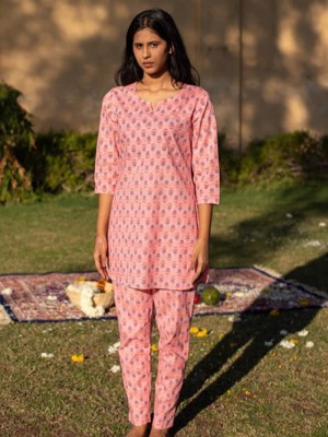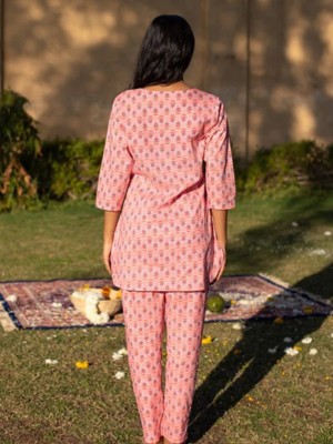 • Orange Cotton Nightwear Dress Kurti Pyjama Co Ord Set for Summer Night