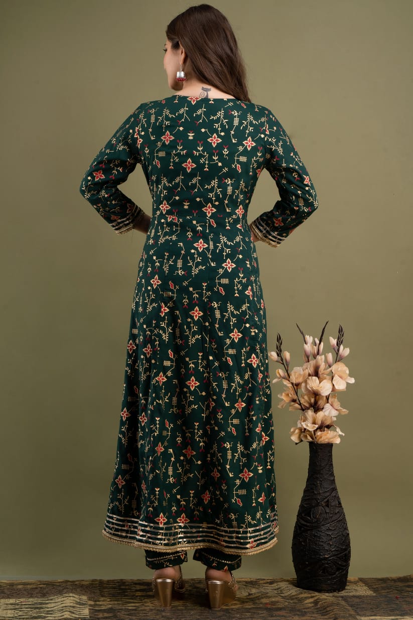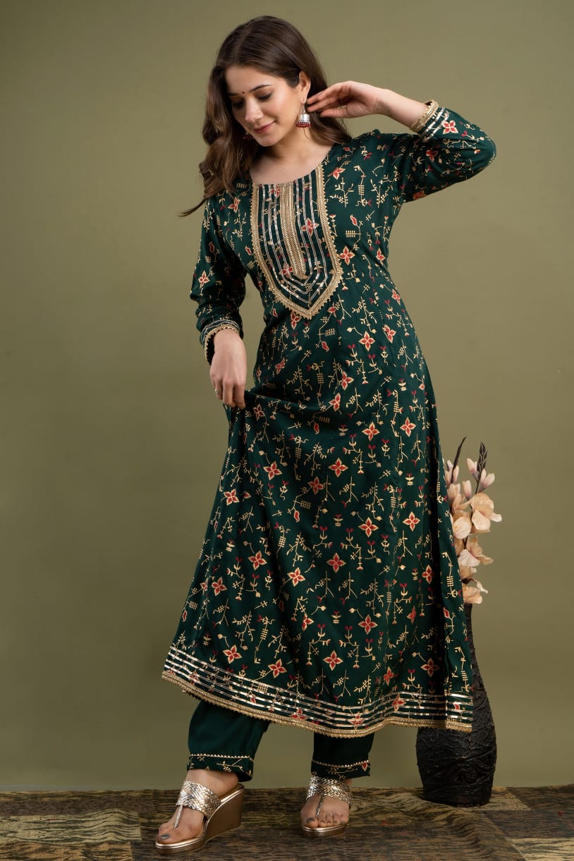 Green Color Plus Size Floral Printed Anarkali Style Kurti Pant Dupatta Salwar Kameez Suit Online