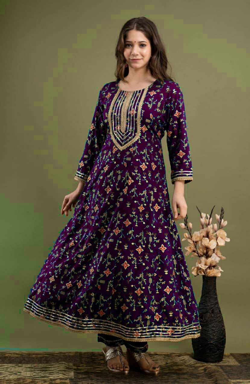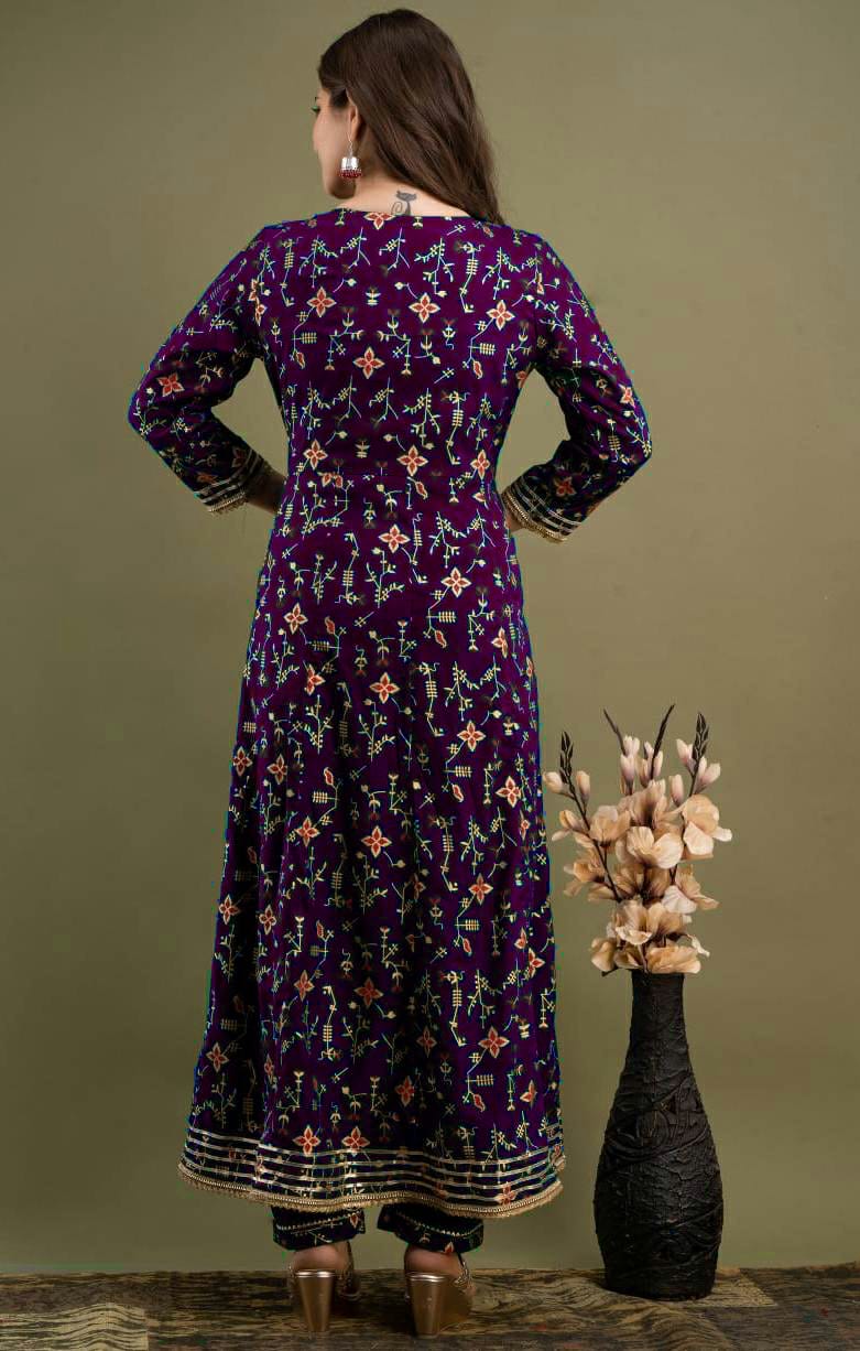 • Purple Color Plus Size Floral Printed Anarkali Style Kurti Pant Dupatta Salwar Kameez Suit Online