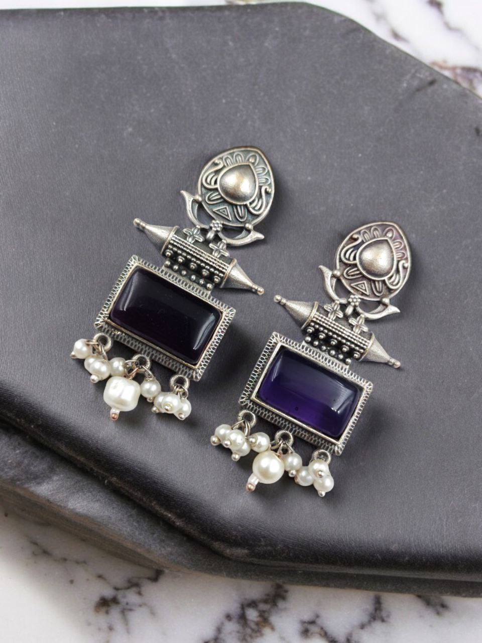 Amethyst Antique Gypsy Silver Replica Brass Oxidized Monalisa Stones Stud Trendy Indian Boho Jewellery