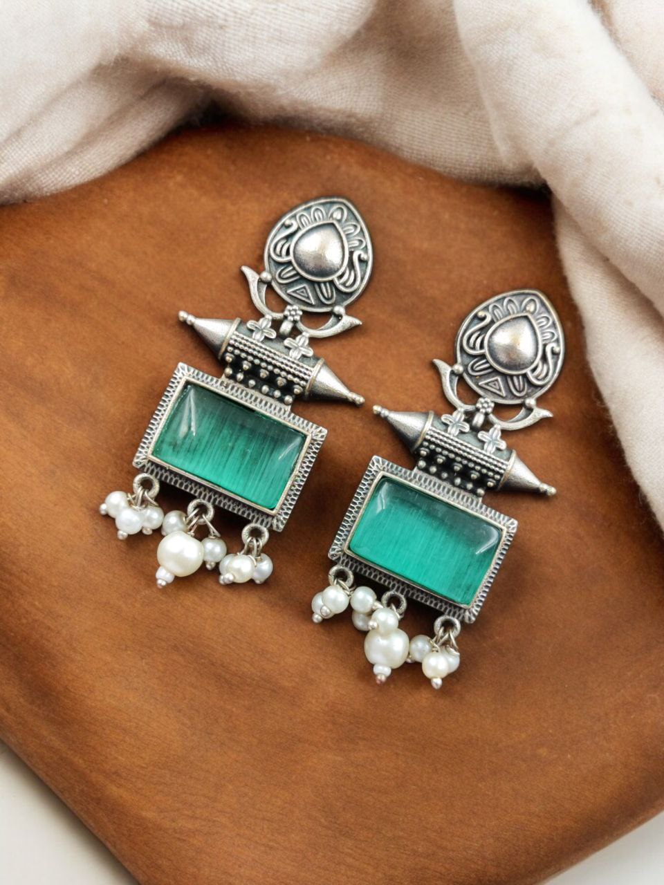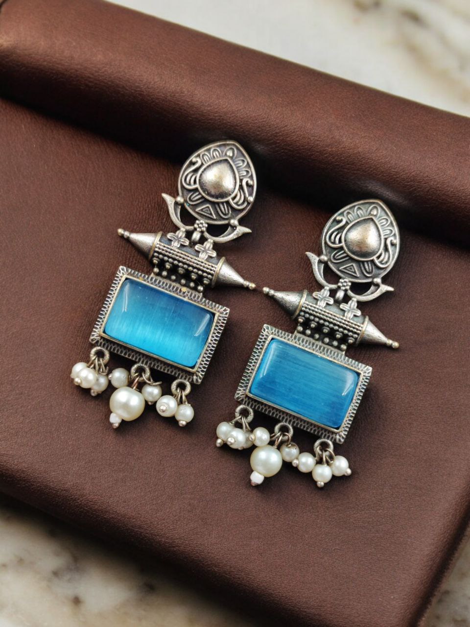Aqua Antique Gypsy Silver Replica Brass Oxidized Monalisa Stones Stud Trendy Indian Boho Jewellery