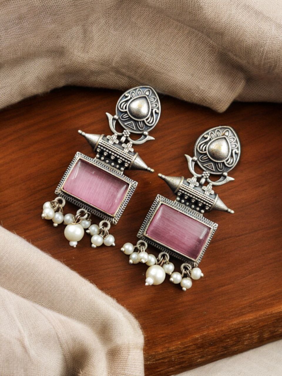 Baby Pink Antique Gypsy Silver Replica Brass Oxidized Monalisa Stones Stud Trendy Indian Boho Jewellery