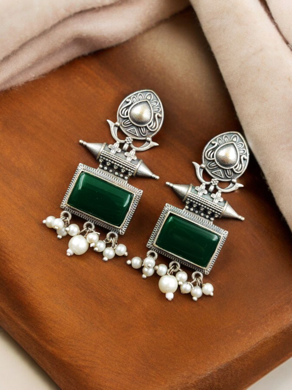 Green Antique Gypsy Silver Replica Brass Oxidized Monalisa Stones Stud Trendy Indian Boho Jewellery