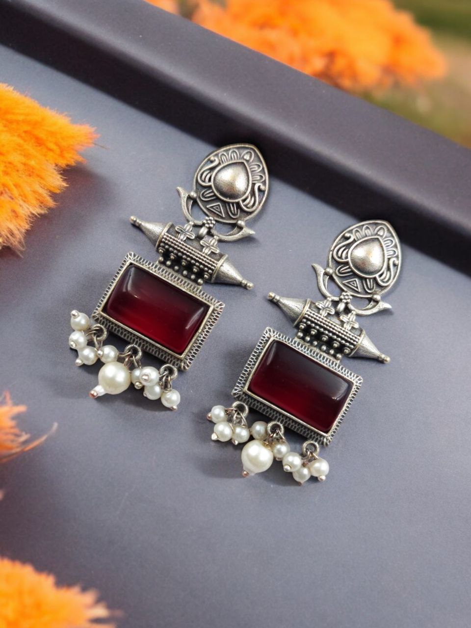 Red Antique Gypsy Silver Replica Brass Oxidized Monalisa Stones Stud Trendy Indian Boho Jewellery