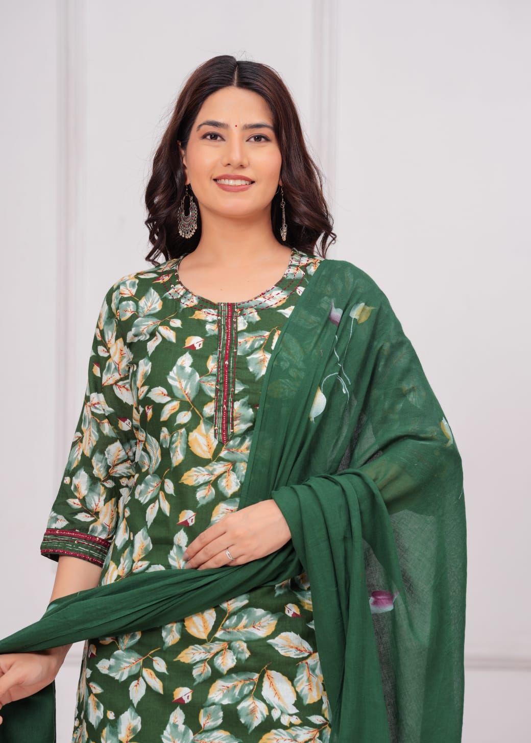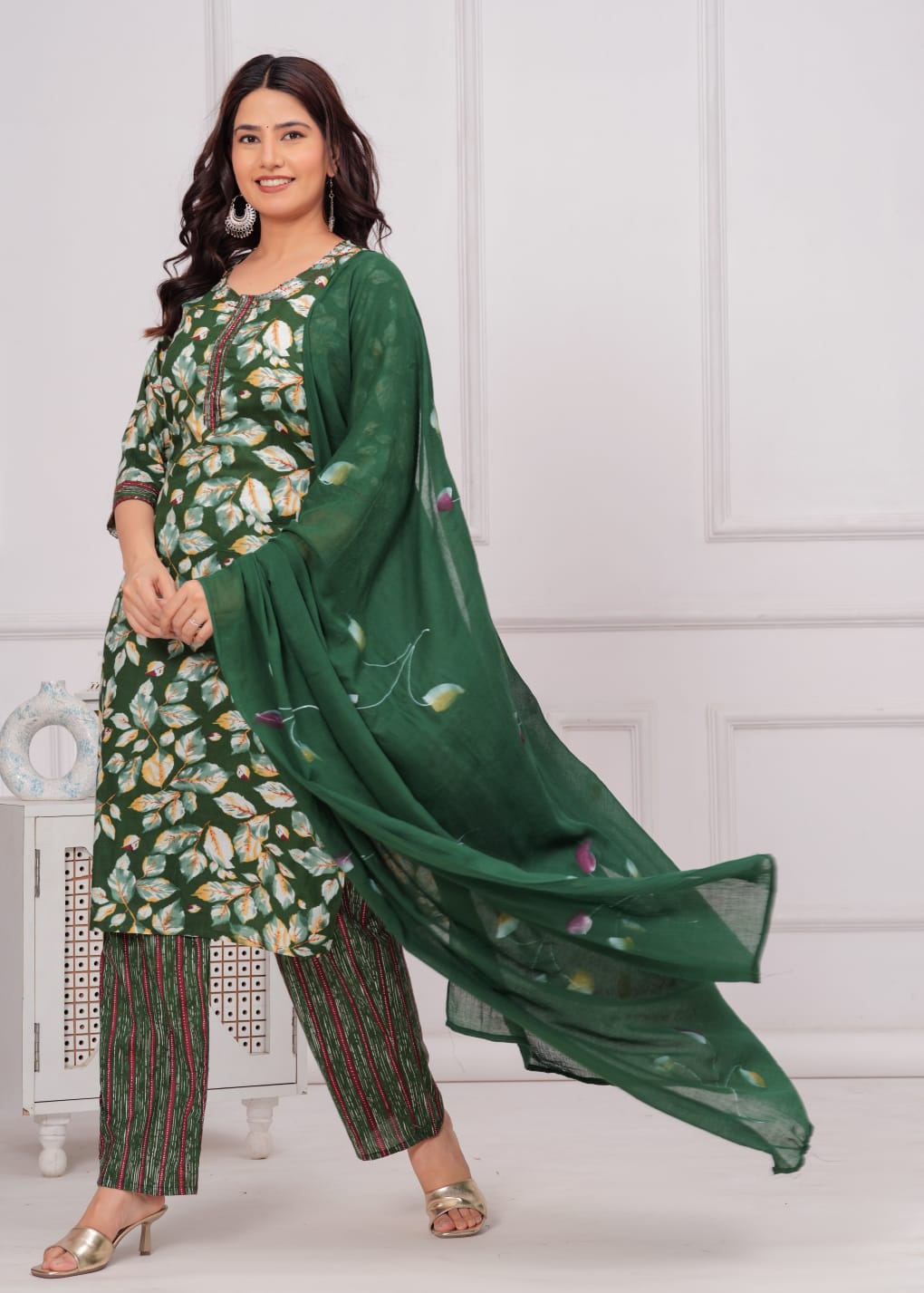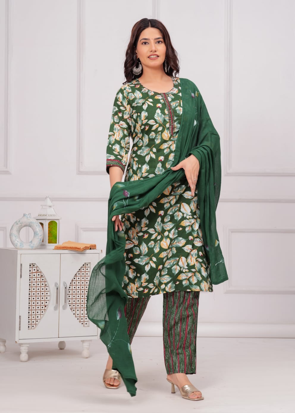 Elevate your ethnic wardrobe with this exquisite Green Floral Printed Salwar Kameez Set. Crafted from lightweight Cotton fabric, the ensemble features a charming floral pattern in vibrant green hues, adding a fresh touch to your style. The straight-cut kurti, paired with matching pants, offers a flattering silhouette, while the delicate dupatta completes the look. Perfect for festive occasions or casual gatherings, this set combines traditional elegance with modern comfort. Embrace grace and sophistication with this stunning outfit.