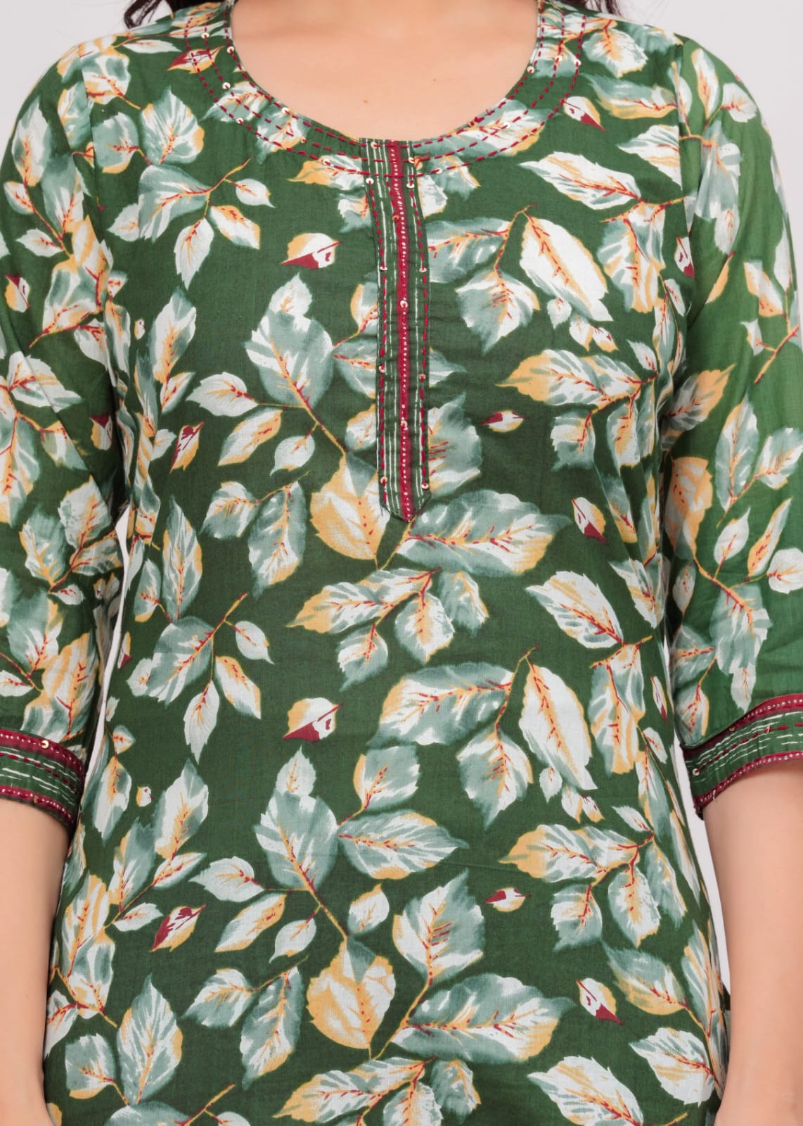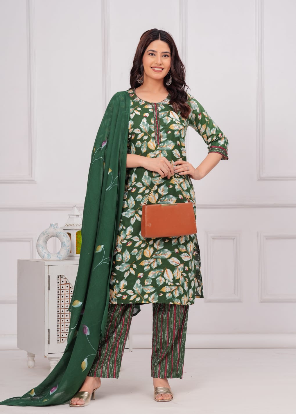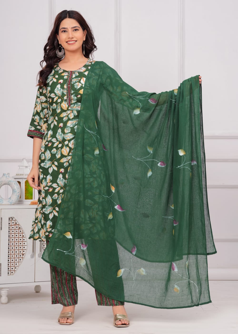Elevate your ethnic wardrobe with this exquisite Green Floral Printed Salwar Kameez Set. Crafted from lightweight Cotton fabric, the ensemble features a charming floral pattern in vibrant green hues, adding a fresh touch to your style. The straight-cut kurti, paired with matching pants, offers a flattering silhouette, while the delicate dupatta completes the look. Perfect for festive occasions or casual gatherings, this set combines traditional elegance with modern comfort. Embrace grace and sophistication with this stunning outfit.