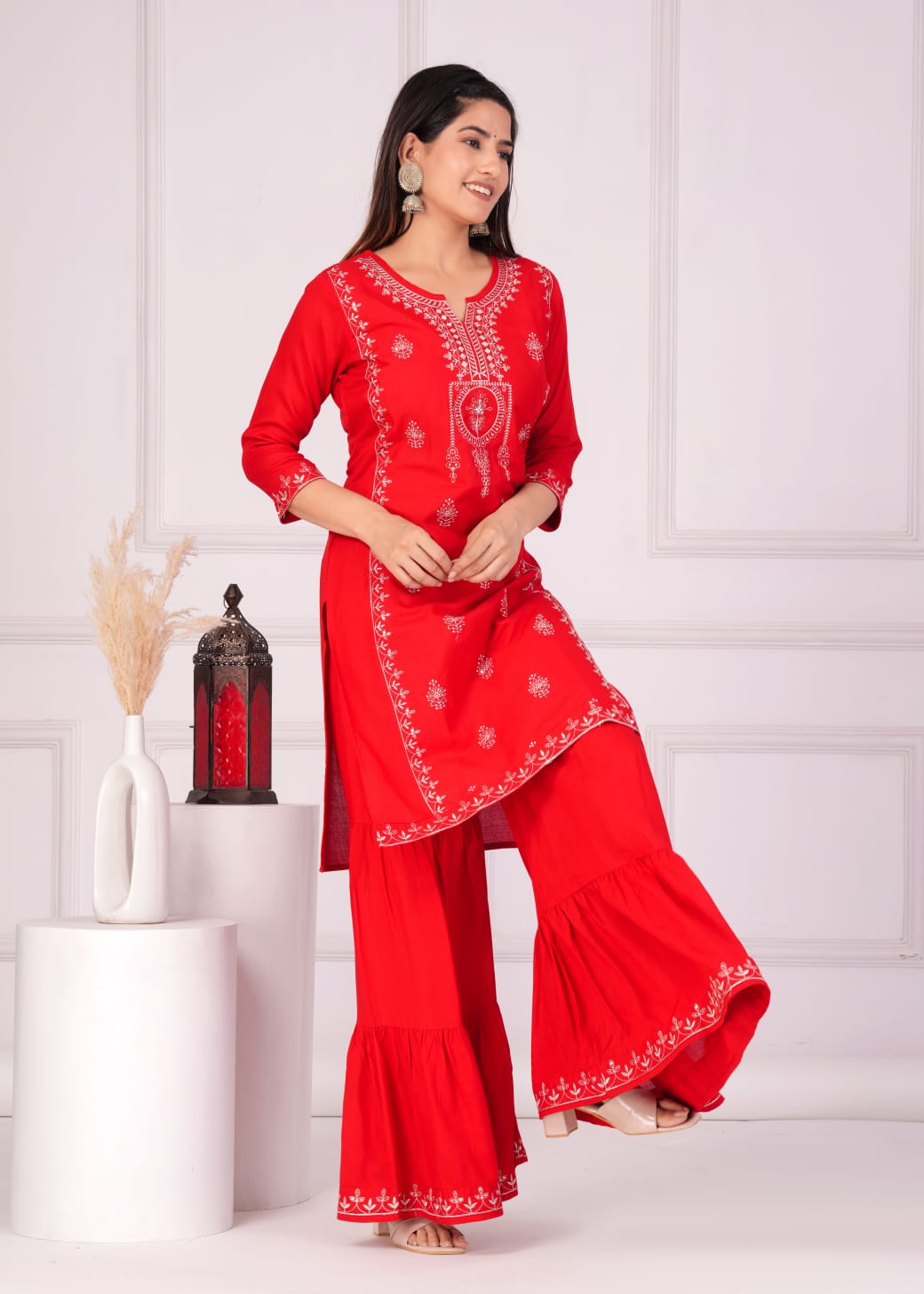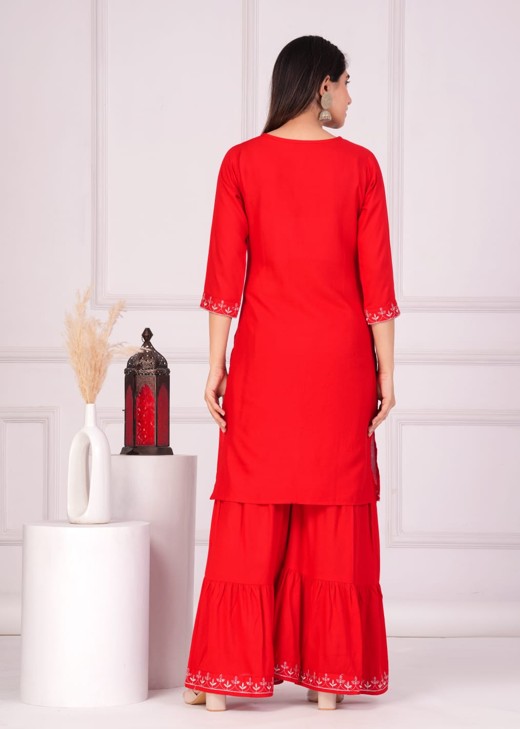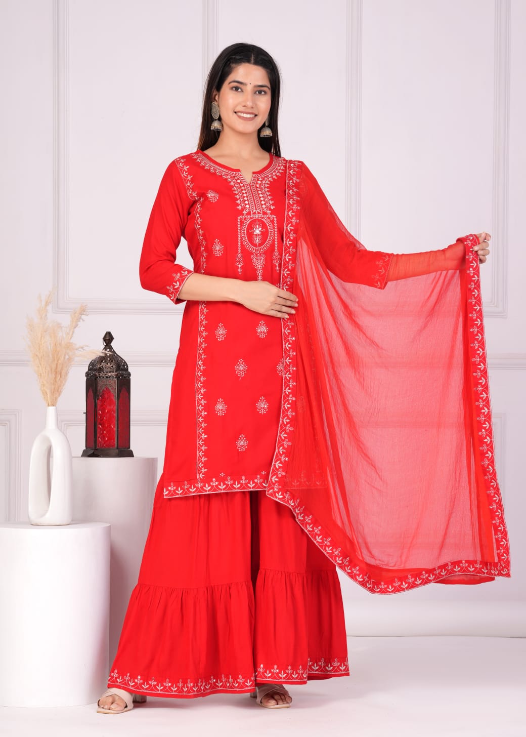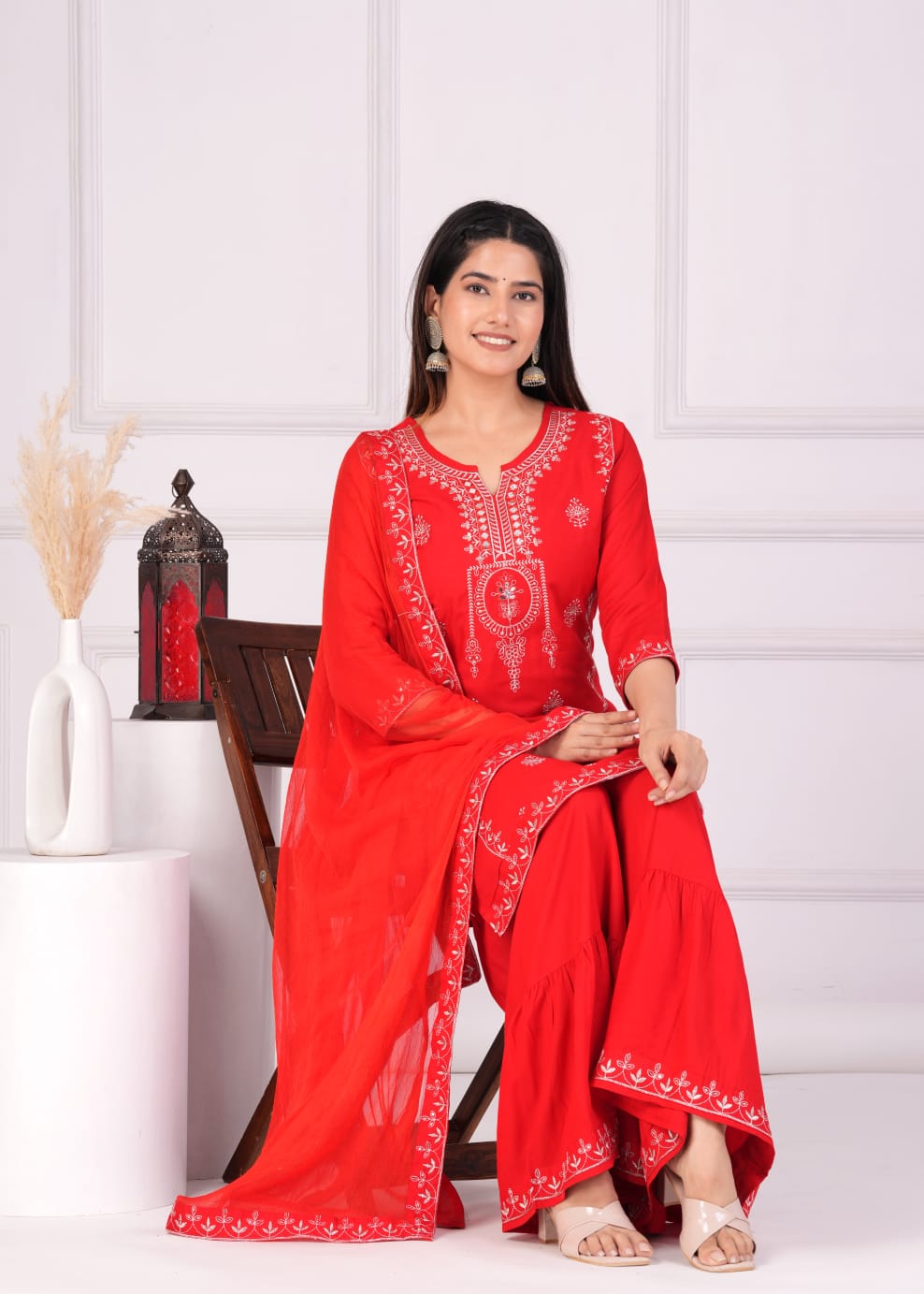 Celebrate Karwa Chauth in stunning style with our Suhagan Red Kurti Sharara Dupatta Set. This designer salwar kameez suit features a vibrant red kurti, elegantly embroidered with intricate designs that shimmer with traditional charm. The flared sharara pants add a touch of grace, while the matching dupatta drapes beautifully, completing the ensemble. Crafted from premium rayon, this set offers both comfort and elegance, making it perfect for festive occasions. Embrace the festive spirit and make a statement with this exquisite and captivating outfit.