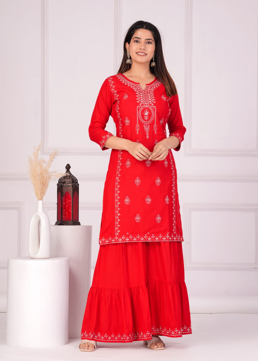 Suhagan Red Color Kurti Sharara Dupatta Rayon Designer Embroidered Salwar Kameez Suit Set for Karwa Chauth