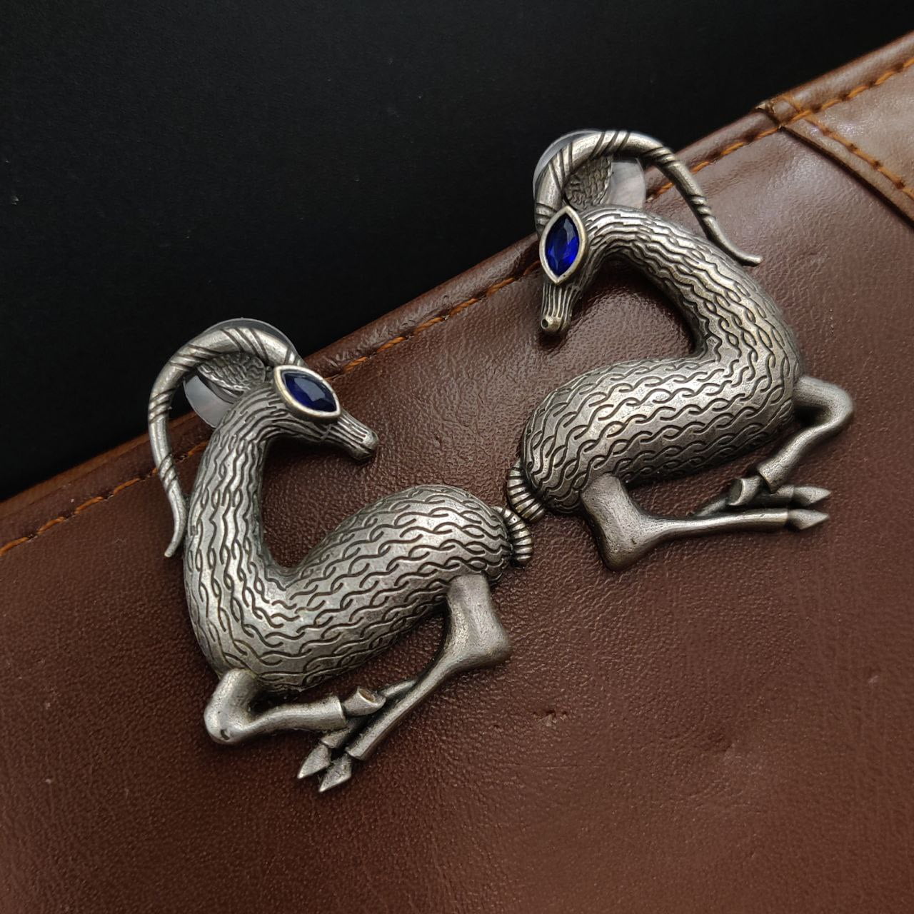 Blue Spiral Horned Deer Earrings Silver Replica Brass Stud Boho Animal Earrings for Girls