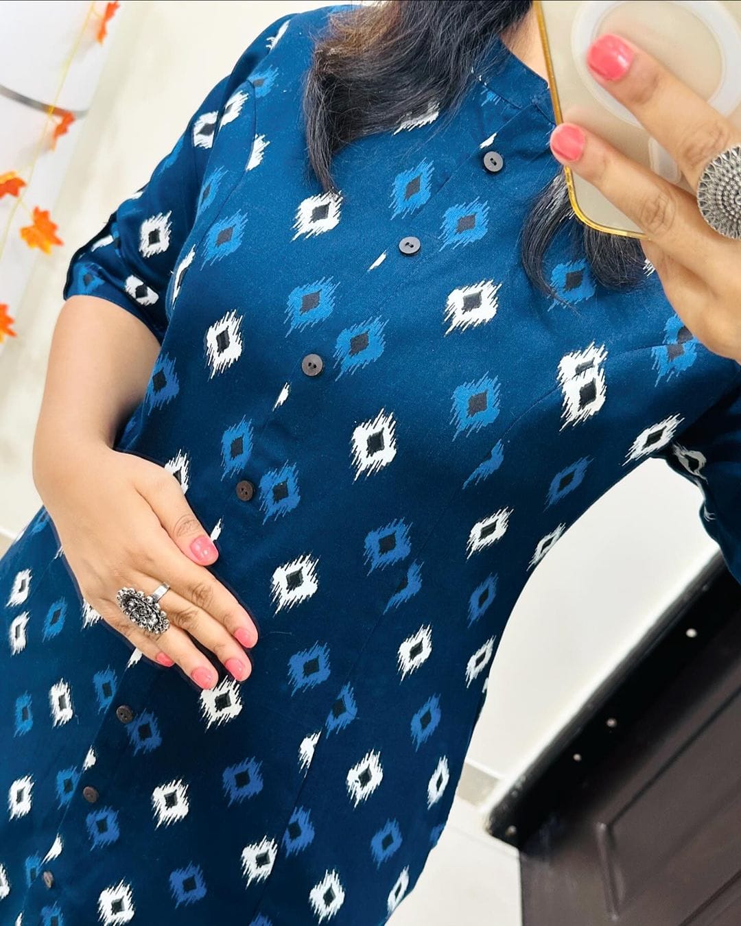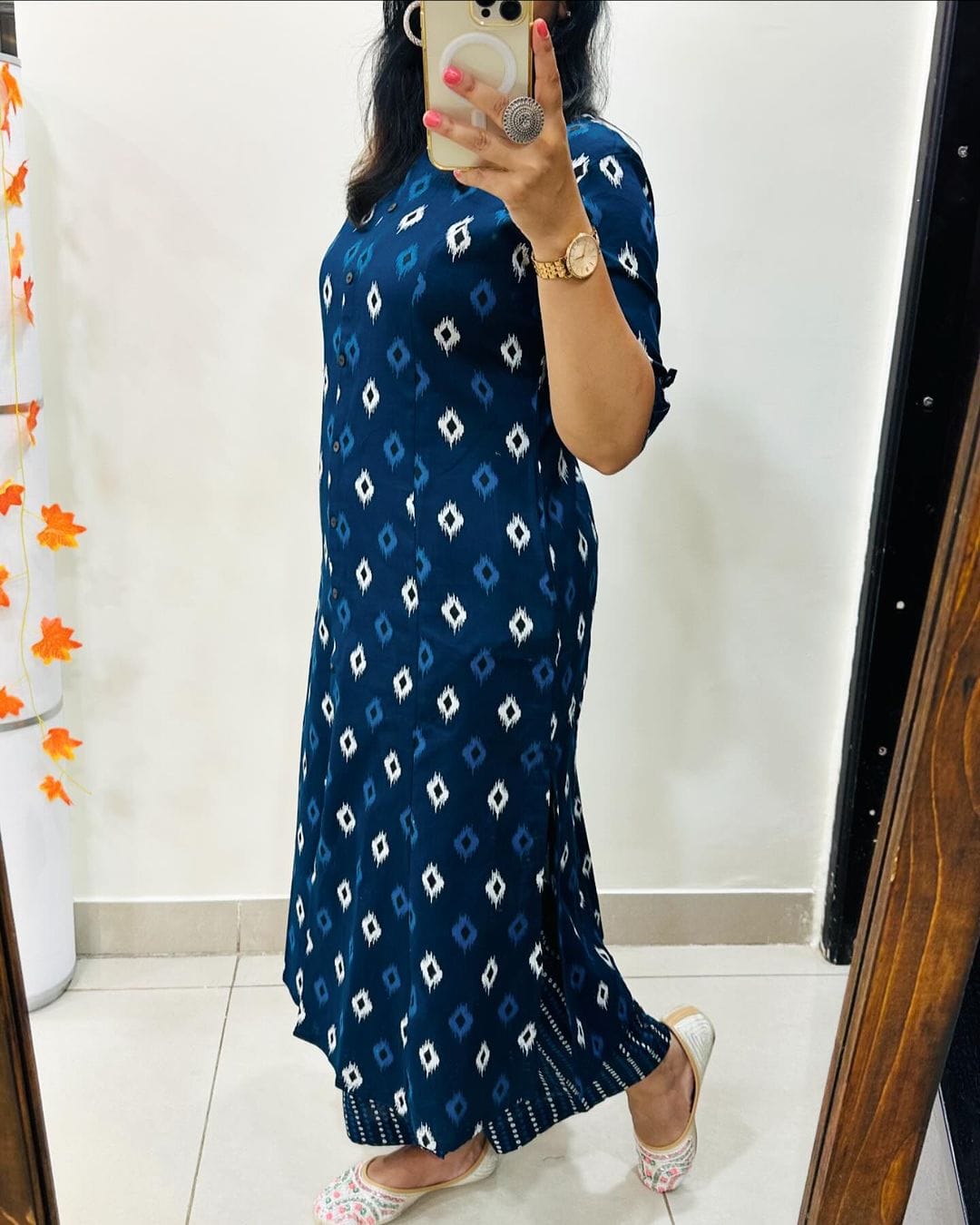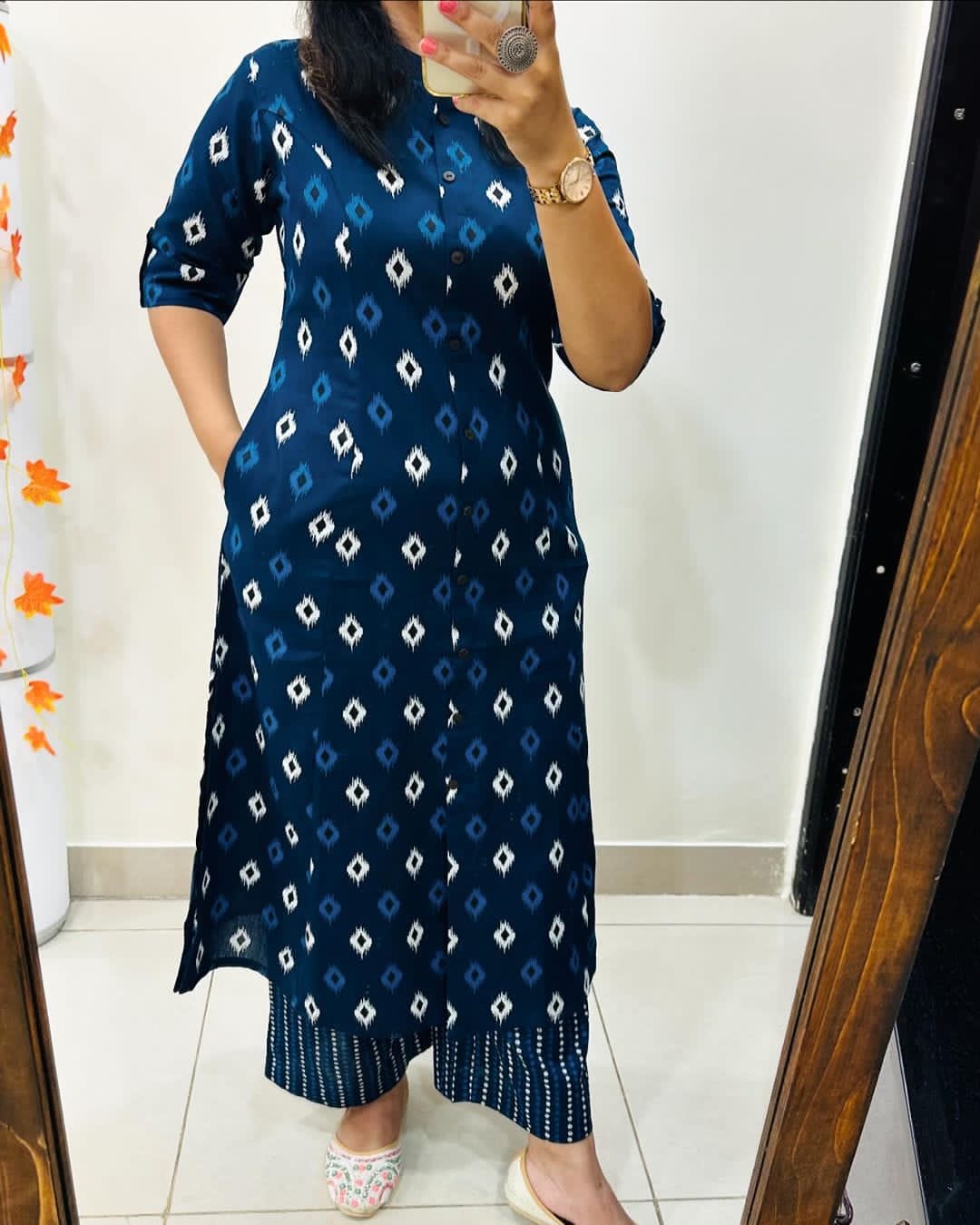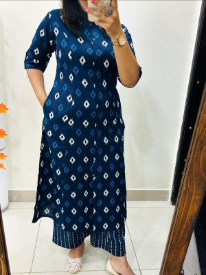 Mili Blue Printed Indian Cotton Salwar Kameez A line Kurti Pant Co Ord Set