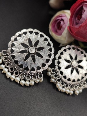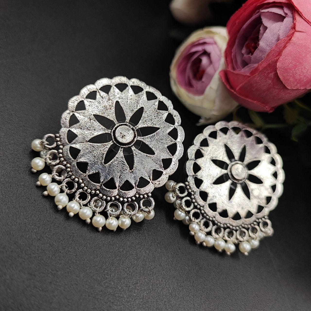 Rustic Gypsy Silver Oxidised Round Stud Pearl Beads Drop Tribal Earrings