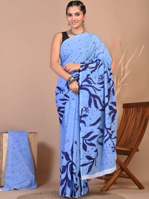 Piya Blue Hand Block Printed Cotton Mulmul Mul Saree with Unstitched Blouse Piece