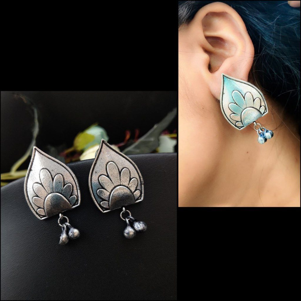 Vintage Artisan Shield Gypsy Silver Oxidised Stud Ghunghroo Drop Earrings