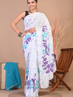 Mahiya White Blue Hand Block Floral Printed Cotton Mulmul Mul Saree with Unstitched Blouse Piece
