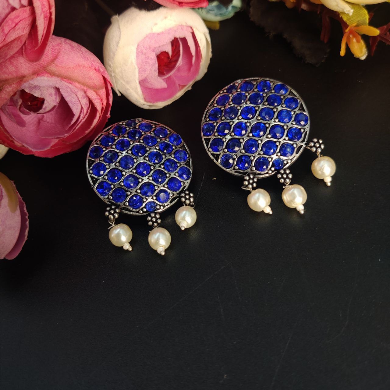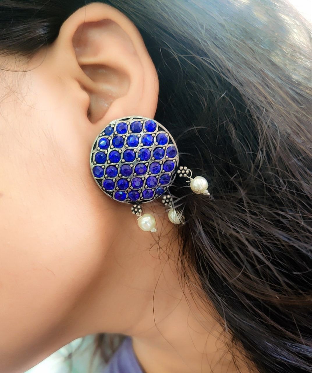 Blue Unique Indian Jewellery Stone Work Silver Oxidised Stud Pearl Ghunghroo Drop Earrings