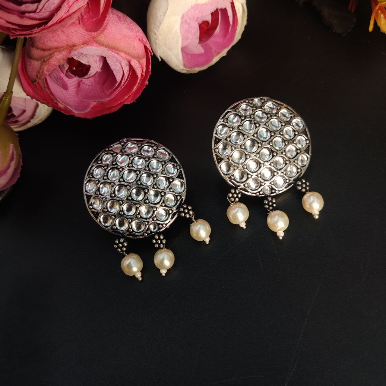 Unique Indian Jewellery Stone Work Silver Oxidised Stud Pearl Ghunghroo Drop Earrings