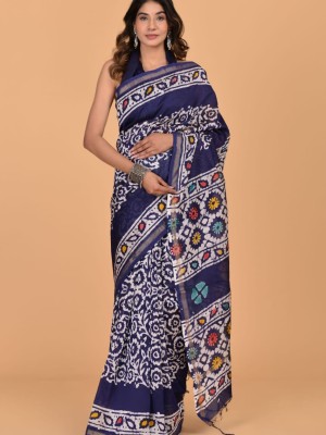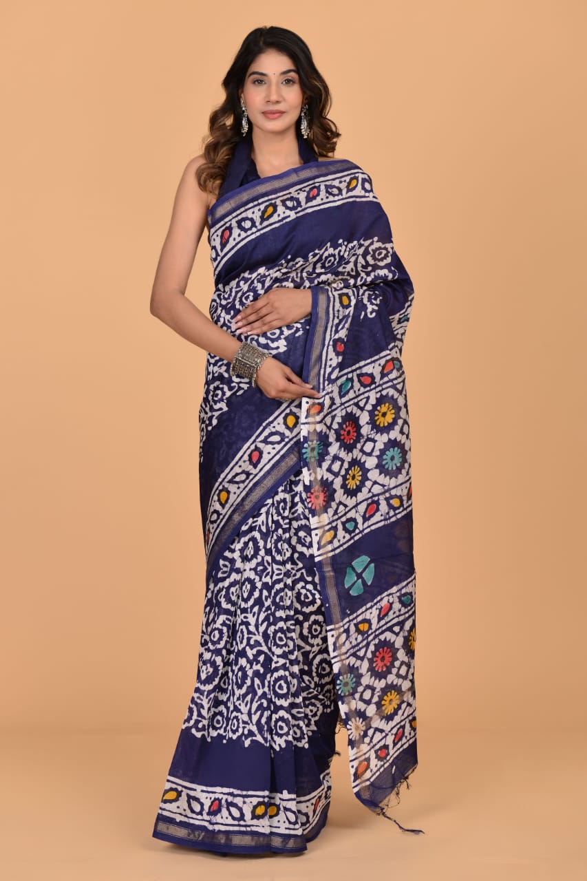 Affordable Blue Chanderi Silk Saree Hand Block Floral Printed with Unstitched Blouse
