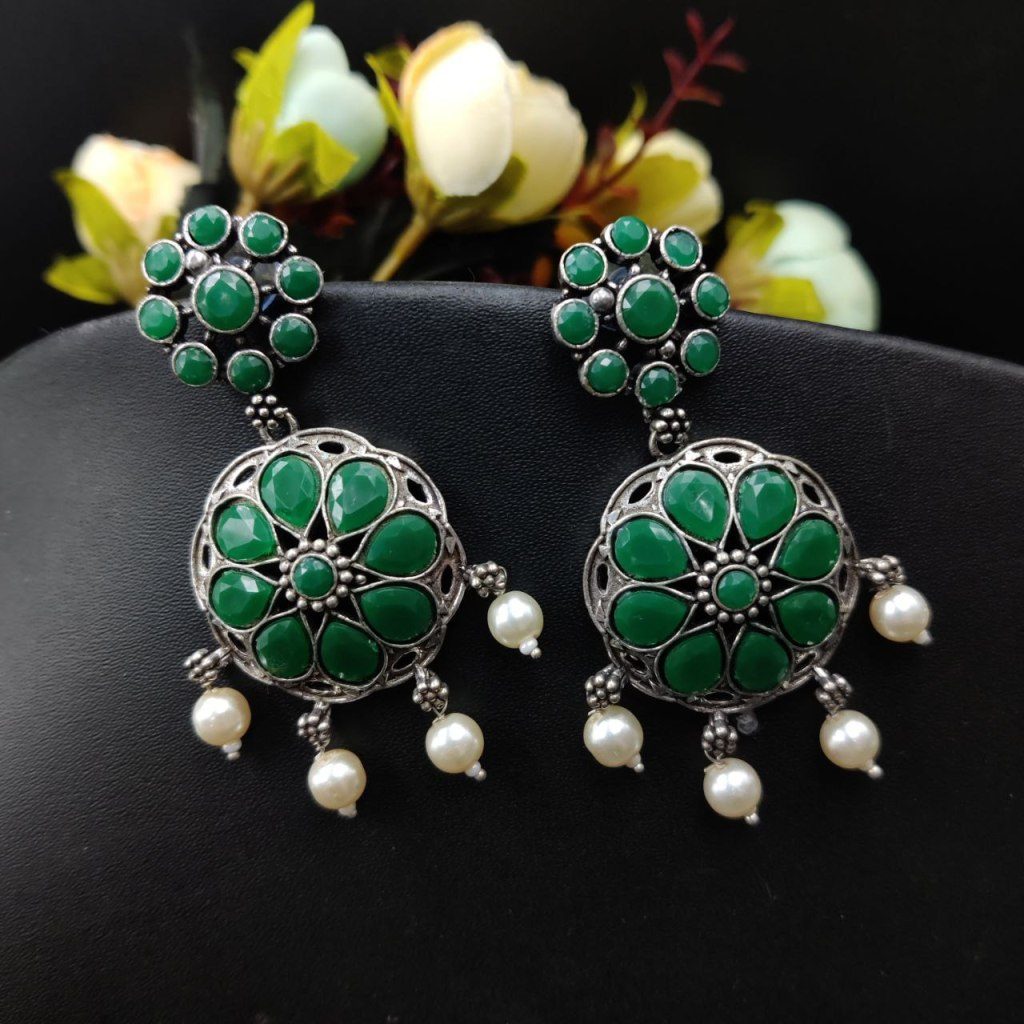 Green Traditional Indian Designer Silver Oxidised Dangler Jewellery Stone Work Earrings