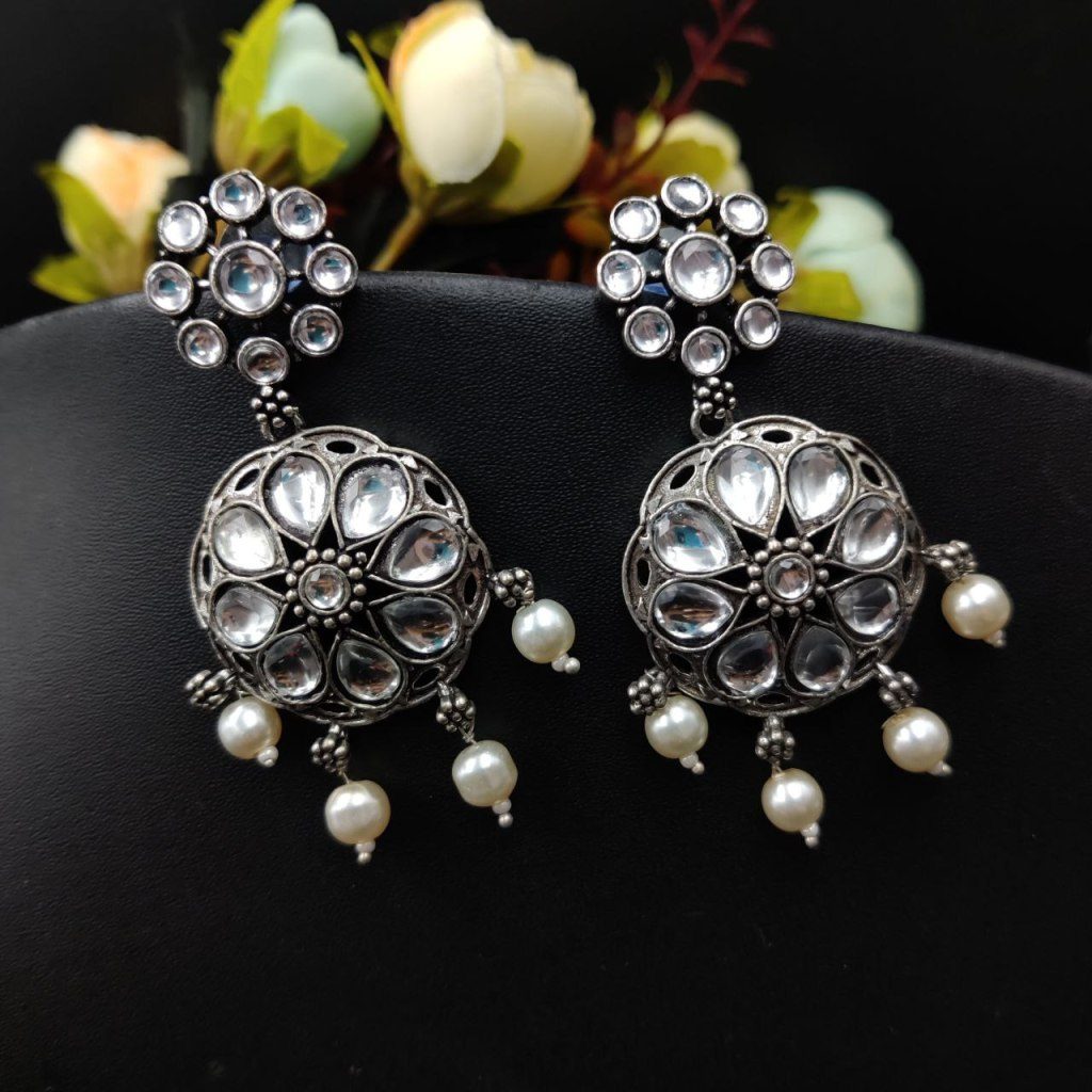 White Traditional Indian Designer Silver Oxidised Dangler Jewellery Stone Work Earrings