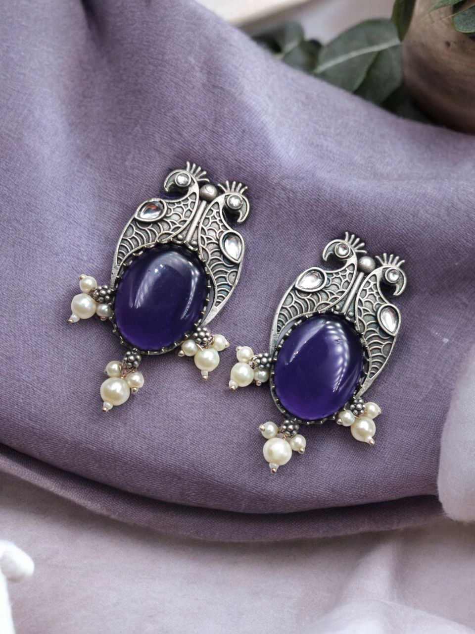 Amethyst Rustic Indian Peacock Silver Oxidised Stud Monalisa Stone Pearl Beads Boho Earrings