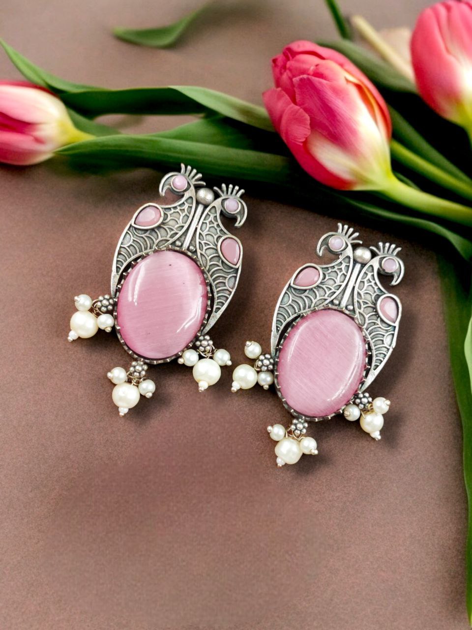 Baby Pink Rustic Indian Peacock Silver Oxidised Stud Monalisa Stone Pearl Beads Boho Earrings