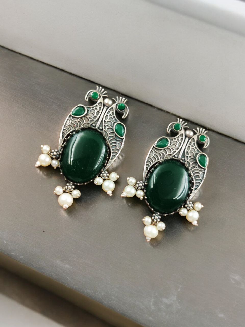 Green Rustic Indian Peacock Silver Oxidised Stud Monalisa Stone Pearl Beads Boho Earrings