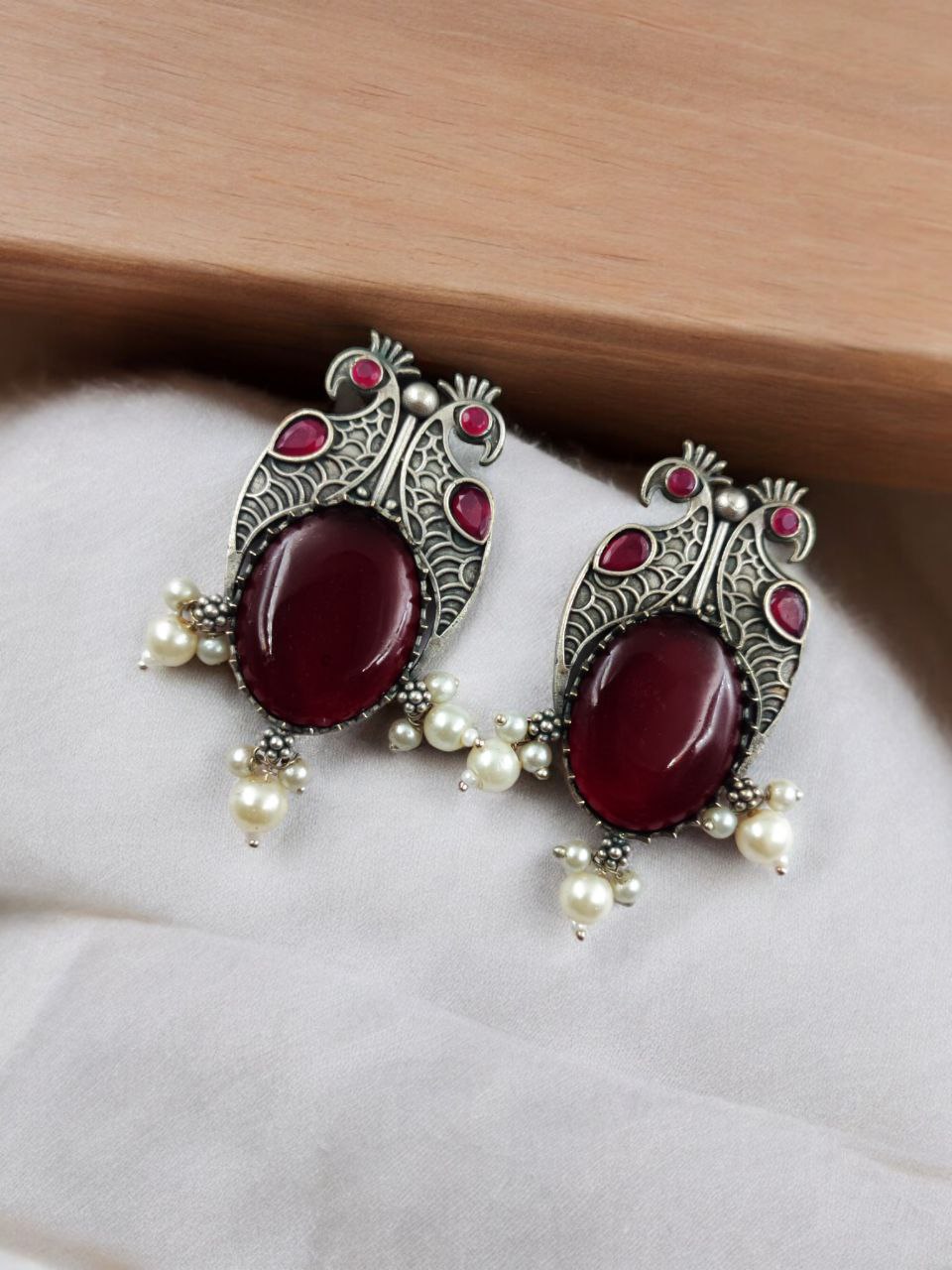 Red Rustic Indian Peacock Silver Oxidised Stud Monalisa Stone Pearl Beads Boho Earrings
