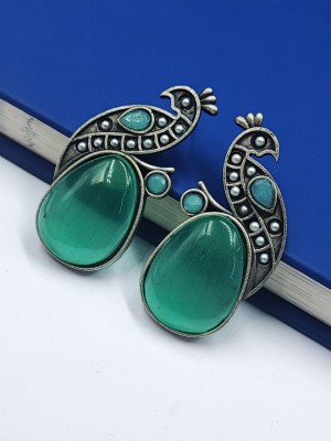 Mint Rustic Indian Peacock Silver Oxidised Stud Monalisa Stone Pearl Beads Boho Earrings