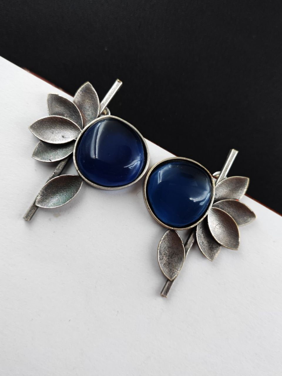 Blue Unique Half Flower Silver Oxidised Stud Monalisa Stone Earrings for Girls