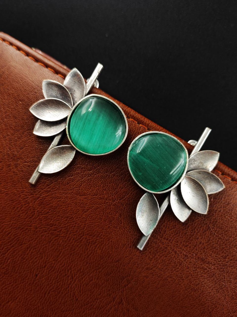 Green Unique Half Flower Silver Oxidised Stud Monalisa Stone Earrings for Girls