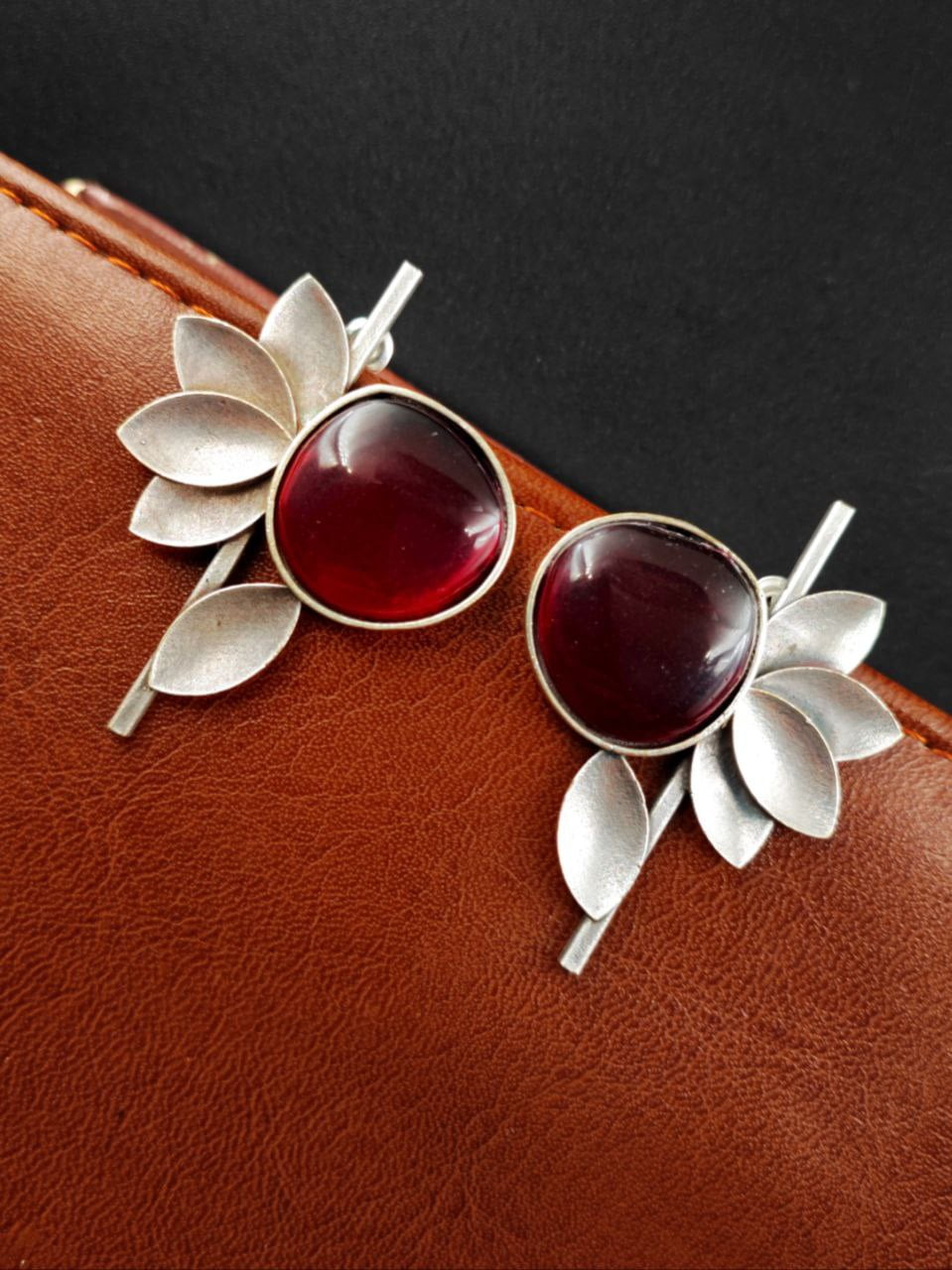 Red Unique Half Flower Silver Oxidised Stud Monalisa Stone Earrings for Girls