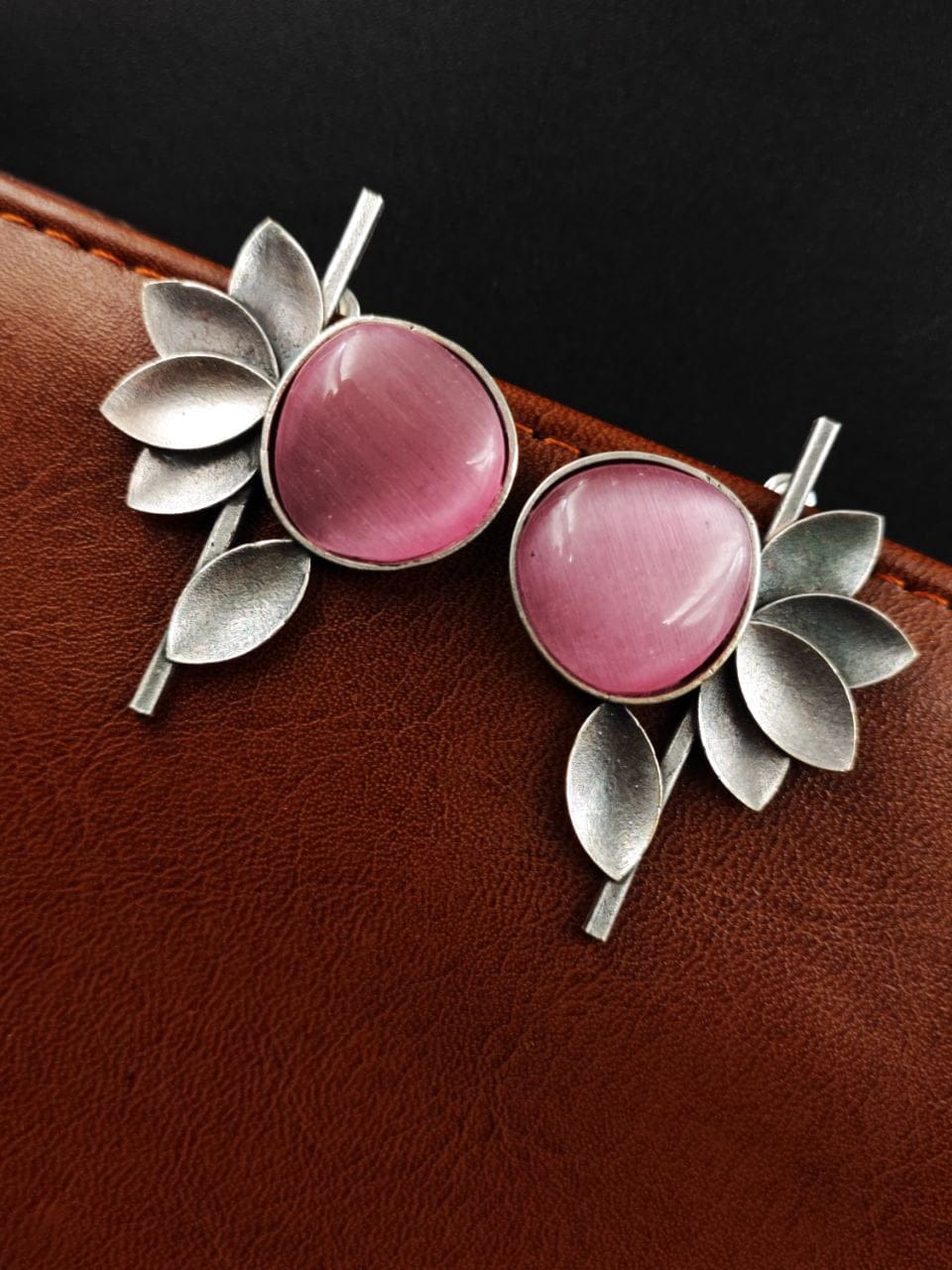 Babypink Unique Half Flower Silver Oxidised Stud Monalisa Stone Earrings for Girls