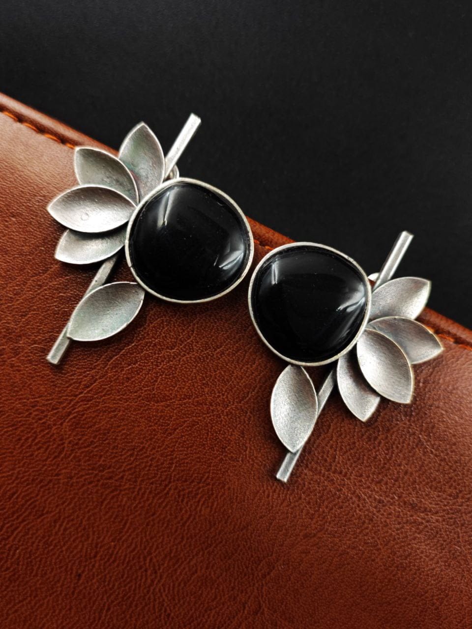 Black Unique Half Flower Silver Oxidised Stud Monalisa Stone Earrings for Girls