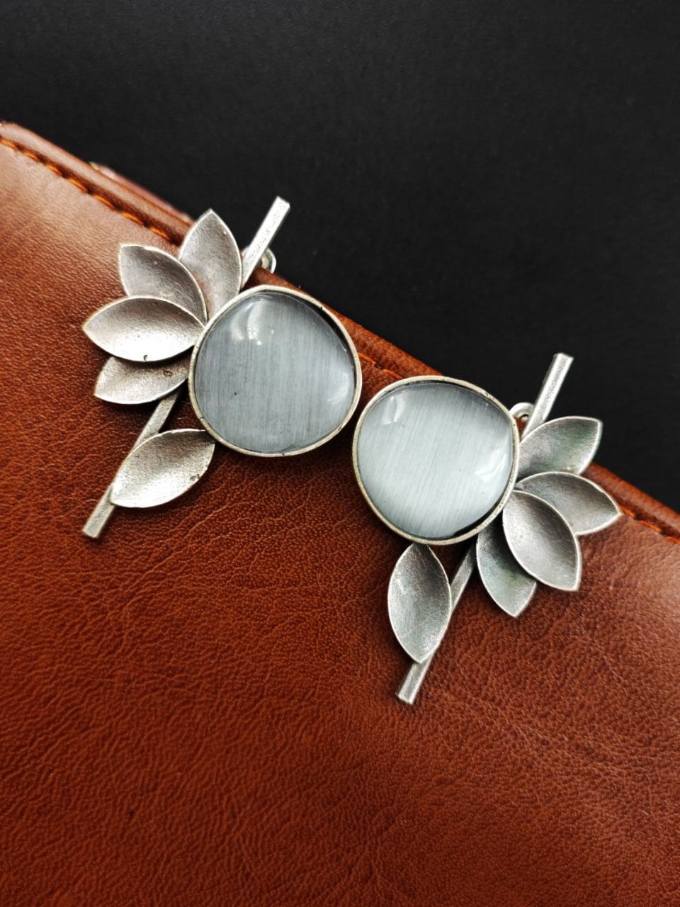 Grey Unique Half Flower Silver Oxidised Stud Monalisa Stone Earrings for Girls