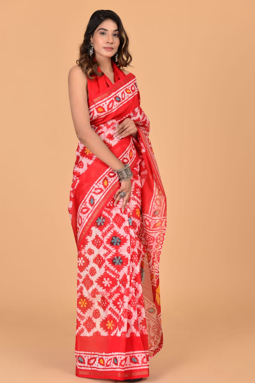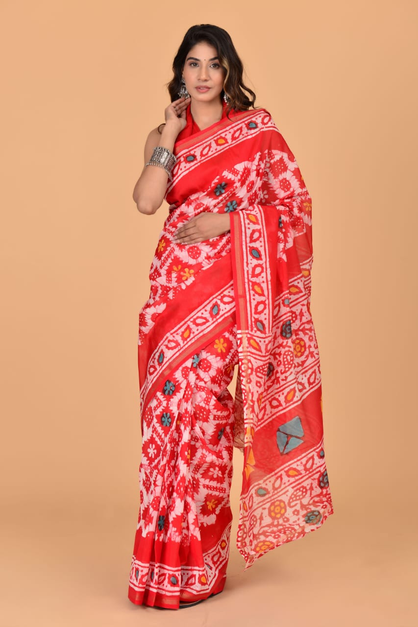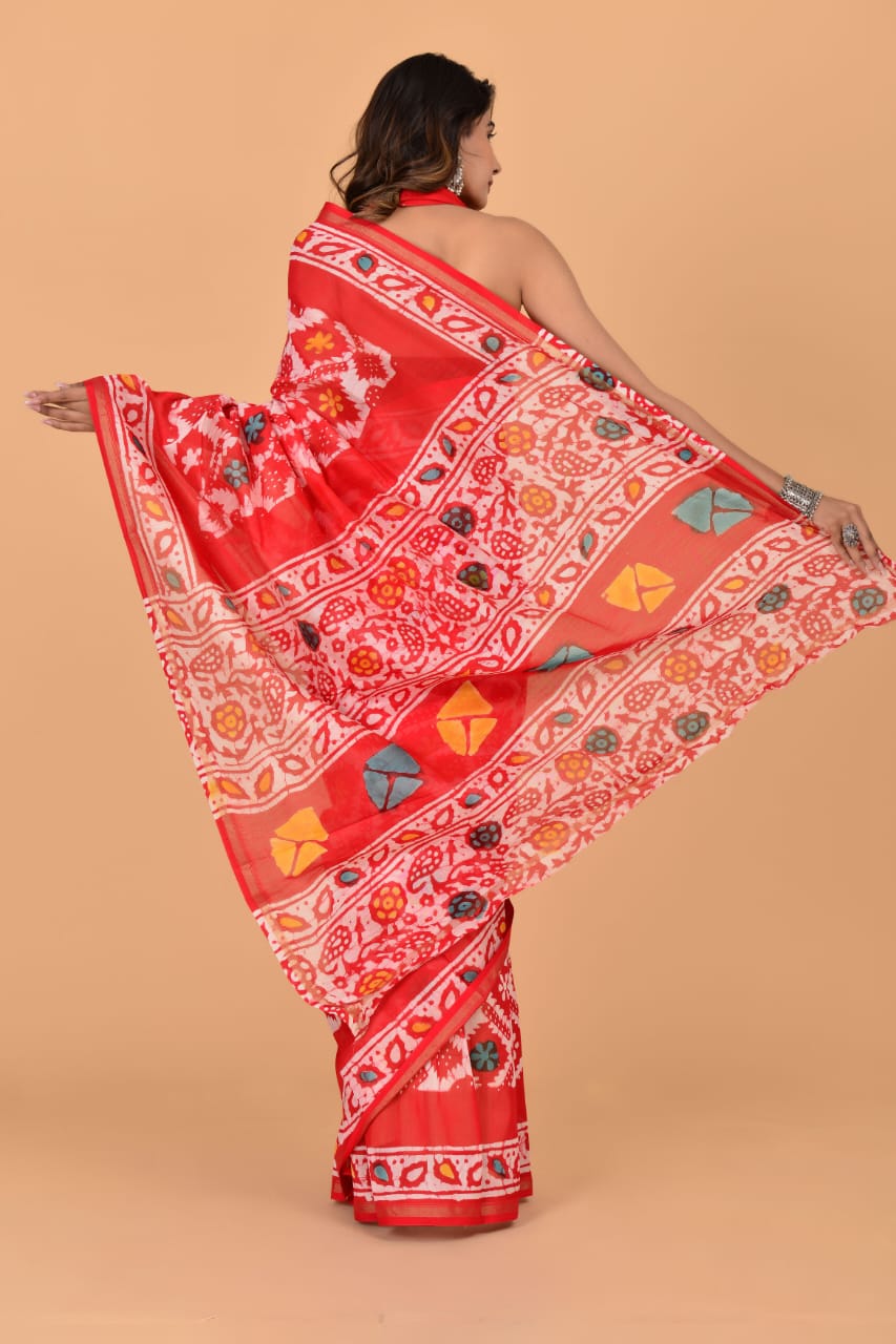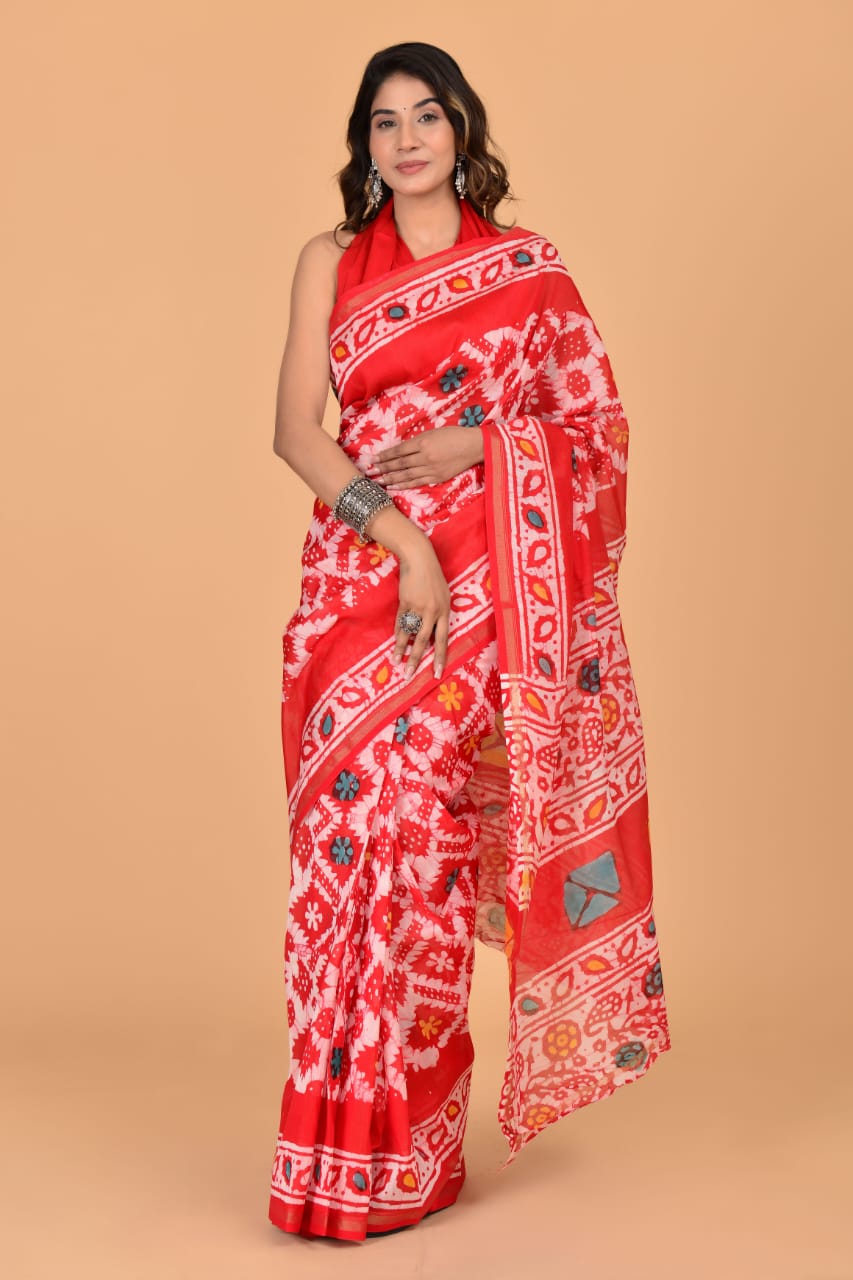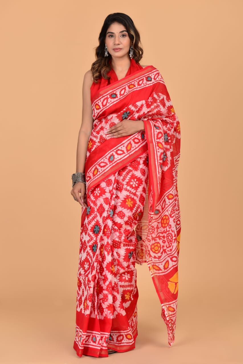 Roma Red Chanderi Silk Saree Hand Block Floral Printed with Unstitched Blouse