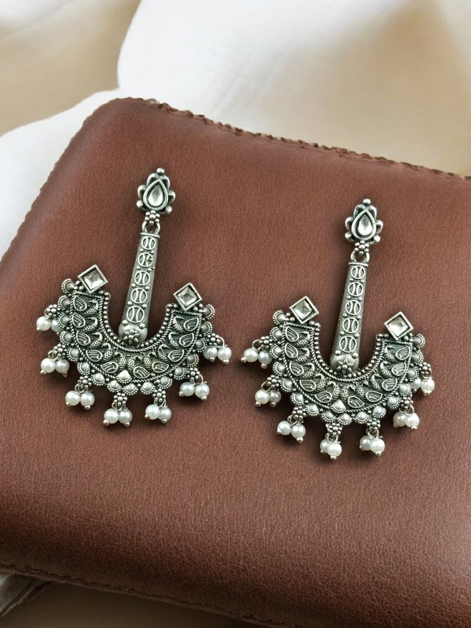 White Vintage Gypsy Rustic Silver Oxidised Brass Dangler Pearl Beads Drop Bohemian Earrings