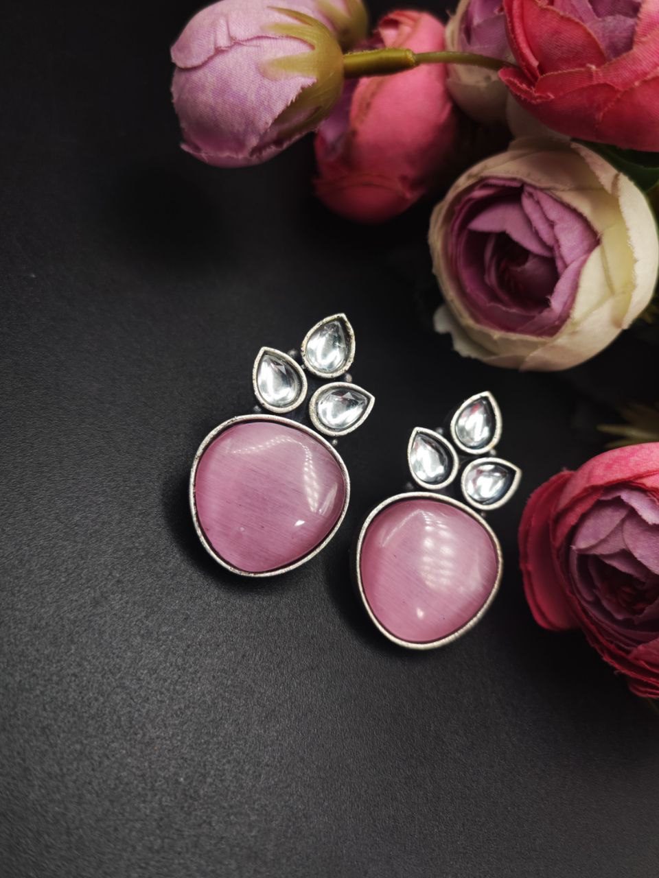 Baby Pink Antique Monalisa Stone Stud Earring Silver Oxidised Exclusive Boho Hippie Earrings